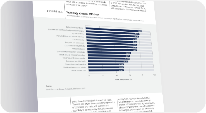 2.2 Expected impact of technology adoption on business transformation and employment The Fourth Industrial Revolution has accelerated Relative adoption of technologies the pace of adoption of technologies and shifted the frontier between humans and machines across sectors and geographies. Technology is altering Future of Jobs Survey results highlight expected the way we work, but also changing job content, future trends in technology adoption across skills in need, and which jobs are being displaced.43 industries. Figure 2.4 presents the technologies Understanding how technologies will impact labour according to companies’ likelihood to adopt them markets is crucial for determining whether people by 2027. As in previous years, big data, cloud will be able to transition from declining occupations computing and AI feature near the top of this list, 44 to the jobs of tomorrow. with approximately 75% of companies looking to FIGURE 2.4 Technology adoption, 2023-2027 Technologies ranked by the share of organizations surveyed who are likely or highly likely to adopt this technology over the next 5 years Digital platforms and apps 86.4% Education and workforce development technologies 80.9% Big-data analytics 80.0% Internet of things and connected devices 76.8% Cloud computing 76.6% Encryption and cybersecurity 75.6% E-commerce and digital trade 75.3% Artificial intelligence 74.9% Environmental management technologies 64.5% Climate-change mitigation technology 62.8% Text, image, and voice processing 61.8% Augmented and virtual reality 59.1% Power storage and generation 52.1% Electric and autonomous vehicles 51.5% Robots, non-humanoid 51.3% 0 20 40 60 80 100 Share of respondents (%) Source World Economic Forum, Future of Jobs Survey 2023. adopt these technologies in the next five years. employment. Figure 2.5 shows that all but The data also shows the impact of the digitalization two technologies are expected to be net job of commerce and trade, with platforms and creators in the next five years. Big data analytics, apps likely to be adopted by 86% of companies climate change and environmental management and e-commerce and digital trade likely to be technologies, and encryption and cybersecurity adopted by 75% of businesses. The second- are expected to be the biggest drivers of job ranked technology is education and workforce growth. Agriculture technologies, digital platforms technologies, with 81% of companies looking to and apps, e-commerce and digital trade, and adopt this technology by 2027. AI are all expected to result in significant labour- market disruption, with substantial proportions of companies forecasting job displacement in their Expected impact of technology organizations, offset by job growth elsewhere to adoption on jobs result in a net positive. Generative AI has received particular attention recently, with claims that 19% of the workforce could have over 50% of their 45 The Future of Jobs Survey also probes the tasks automated by AI and job losses making expected impact of technology adoption on headlines, while others expect the technology to Future of Jobs Report 2023 24