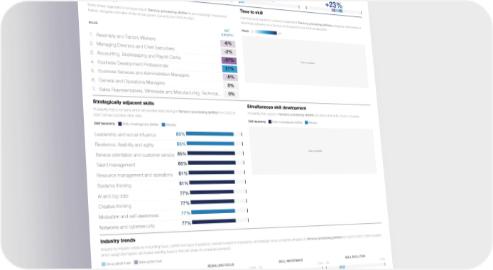 Skill Profile Reskilling Ranking Sensory-processing abilities 26th Skills, knowledge and abilities Physical abilities Sensory-processing abilities Global Skills Taxonomy / / Five year trend Reskilling focus Skill importance Skill evolution Learning hours spent pursuing assessements and Companies for which Sensory-processing Companies for which Sensory-processing Share of companies for which Sensory- credentials in Sensory-processing abilities from abilities is a priority in their upskilling and reskilling abilities is a core skill for workers (share of processing abilities is increasing or decreasing 2017 to 2022 (share of total learning hours). programmes for 2023-2027 (share of companies companies surveyed) in importance at work. White diamond and label Source: Coursera surveyed) represent net share. 4% 8% +23% Data unavailable Jobs in focus Time to skill Roles where organizations surveyed report Sensory-processing abilities to be increasing in importance Learning hours required to achieve a credential in Sensory-processing abilities at beginner, intermediate or fastest, alongside estimates of the net job growth (percent) from 2023 to 2027. advanced proficiency as a function of the learner’s level of formal education. Hours 0 34 NET ROLES GROWTH -6% 1. Assembly and Factory Workers -2% 2. Managing Directors and Chief Executives Data unavailable -27% 3. Accounting, Bookkeeping and Payroll Clerks 21% 4. Business Development Professionals -5% 5. Business Services and Administration Managers 0% 6. General and Operations Managers 0% 7. Sales Representatives, Wholesale and Manufacturing, Technical … Strategically adjacent skills Simultaneous skill development Probability that a company which will prioritise skills training in Sensory-processing abilities from 2023 to Probability that courses in Sensory-processing abilities also teach other skills. Source: Coursera. 2027 will also prioritise other skills. Skill taxonomy Skills, knowledge and abilities Attitudes Skill taxonomy Skills, knowledge and abilities Attitudes 85% Leadership and social influence 85% Resilience, flexibility and agility Data unavailable 85% Service orientation and customer service 85% Talent management 81% Resource management and operations 81% Systems thinking 77% AI and big data 77% Creative thinking 77% Motivation and self-awareness 77% Networks and cybersecurity Industry trends Industry-by-industry variations in reskilling focus, current and future importance, forecast evolution in importance, and strategic focus companies will place on Sensory-processing abilities from 2023 to 2027 for the industries which assign the highest and lowest reskilling focus to this skill (share of companies surveyed) Above global mean Below global mean RESKILLING FOCUS SKILL IMPORTANCE SKILL EVOLUTION INDUSTRY 0% 100% 0% 100% 0% 100% Advanced manufacturing Research, design and business management services Production of consumer goods Infrastructure Retail and wholesale of consumer goods Information and technology services