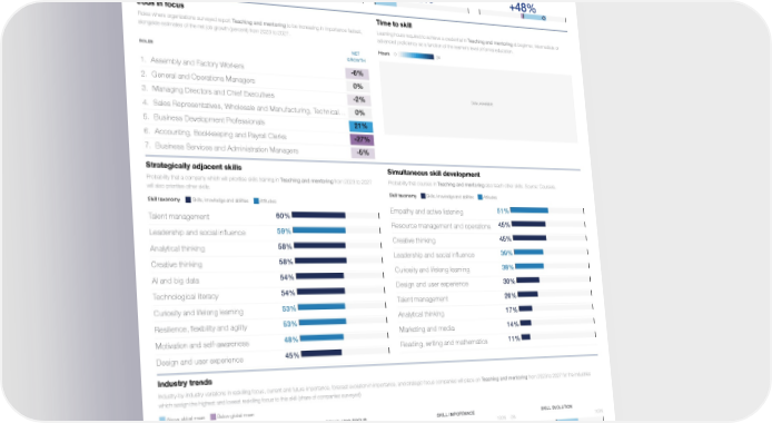 Skill Profile Reskilling Ranking Teaching and mentoring 21st Attitudes Working with others Teaching and mentoring Global Skills Taxonomy / / Five year trend Reskilling focus Skill importance Skill evolution Learning hours spent pursuing assessements and Companies for which Teaching and mentoring is Companies for which Teaching and mentoring is Share of companies for which Teaching and credentials in Teaching and mentoring from 2017 a priority in their upskilling and reskilling a core skill for workers (share of companies mentoring is increasing or decreasing in to 2022 (share of total learning hours). Source: programmes for 2023-2027 (share of companies surveyed) importance at work. White diamond and label Coursera surveyed) represent net share. 1% 14% 22% +48% 0% 2017 2022 Jobs in focus Time to skill Roles where organizations surveyed report Teaching and mentoring to be increasing in importance fastest, Learning hours required to achieve a credential in Teaching and mentoring at beginner, intermediate or alongside estimates of the net job growth (percent) from 2023 to 2027. advanced proficiency as a function of the learner’s level of formal education. Hours 0 34 NET ROLES GROWTH -6% 1. Assembly and Factory Workers 0% 2. General and Operations Managers Data unavailable -2% 3. Managing Directors and Chief Executives 0% 4. Sales Representatives, Wholesale and Manufacturing, Technical … 21% 5. Business Development Professionals -27% 6. Accounting, Bookkeeping and Payroll Clerks -5% 7. Business Services and Administration Managers Strategically adjacent skills Simultaneous skill development Probability that a company which will prioritise skills training in Teaching and mentoring from 2023 to 2027 Probability that courses in Teaching and mentoring also teach other skills. Source: Coursera. will also prioritise other skills. Skill taxonomy Skills, knowledge and abilities Attitudes Skill taxonomy Skills, knowledge and abilities Attitudes 51% Empathy and active listening 60% Talent management 45% Resource management and operations 59% Leadership and social influence 45% Creative thinking 58% Analytical thinking 39% Leadership and social influence 58% Creative thinking 38% Curiosity and lifelong learning 54% AI and big data 30% Design and user experience 54% Technological literacy 26% Talent management 53% Curiosity and lifelong learning 17% Analytical thinking 53% Resilience, flexibility and agility 14% Marketing and media 48% Motivation and self-awareness 11% Reading, writing and mathematics 45% Design and user experience Industry trends Industry-by-industry variations in reskilling focus, current and future importance, forecast evolution in importance, and strategic focus companies will place on Teaching and mentoring from 2023 to 2027 for the industries which assign the highest and lowest reskilling focus to this skill (share of companies surveyed) Above global mean Below global mean RESKILLING FOCUS SKILL IMPORTANCE SKILL EVOLUTION INDUSTRY 0% 100% 0% 100% 0% 100% Education and training Media, Entertainment and Sports Production of consumer goods Business support and premises maintenance services Automotive and Aerospace Oil and gas