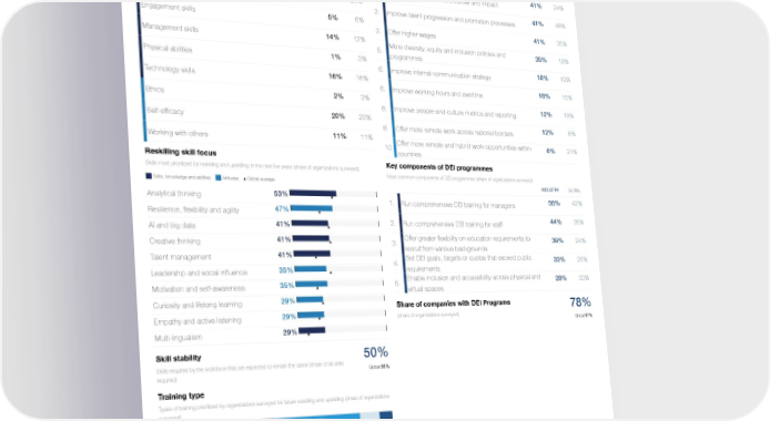 Industry Profile Global Employee (millions, ILO estimates) 2 / 2 Employment services 7.9 6kill outlook Workforce strategy outlook Core skills )usiness practices to improve talent availability 6kills needed to perform well in key, stable roles within the company (share of organizations surveyed) Top practices with the greatest potential to improve talent availability (share of organizations surveyed) INDUSTRY G/2%$/ 6Nills NnoZledge and abilities $ttitudes 47% 2 . Provide eijective reskilling and upskilling INDUSTRY G/2%$/ 41% 2 2. Better articulate business purpose and impact 31% 2 Cognitive skills 41% 2. Improve talent progression and promotion processes 5% Engagement skills 41% 2. 2ijer higher wages 14% 2 Management skills More diversity, eTuity and inclusion policies and 35% . programmes 1% Physical abilities 18% . Improve internal-communication strategy 16% Technology skills 18% . Improve working hours and overtime 2% Ethics 12% . Improve people-and-culture metrics and reporting 20% 2 Self-eĴcacy 12% . 2ijer more remote work across national borders 11 % Working with others 2ijer more remote and hybrid work opportunities within 6% 2 0 countries 9eskilling skill focus Key components of +,0 programmes 6kills most prioritized for reskilling and upskilling in the next five years (share of organizations surveyed) 0ost common components of 'E, programmes (share of organizations surveyed) 6Nills NnoZledge and abilities $ttitudes Global average INDUSTRY G/2%$/ 53% Analytical thinking 56% 2 . Run comprehensive DEI training for managers 47% Resilience, IJexibility and agility 44% 2. Run comprehensive DEI training for staij 41% AI and big data 2ijer greater IJexibility on education reTuirements to 41% 39% 2 Creative thinking . recruit from various backgrounds 41% Talent management Set DEI goals, targets or Tuotas that exceed public 33% 2 . reTuirements 35% /eadership and social inIJuence Enable inclusion and accessibility across physical and 28% . 35% Motivation and self-awareness virtual spaces 29% Curiosity and lifelong learning :hare of companies ^ith +,0 7rograms % 29% (share of organizations surveyed) Empathy and active listening Global % 29% Multi-lingualism :kill stability % 6kills reTuired by the workforce that are expected to remain the same (share of all skills Global % reTuired) Training type Types of training prioritized by organizations surveyed for future reskilling and upskilling (share of organizations surveyed) 2 ROLES INDUSTRY G/2%$/ 11% Employer-sponsored apprenticeships 28% 2 Internal training departments 9% /icensed training from professional associations 38% 27 2n-the-Mob training and coaching 9% 2 Private-sector online-learning platforms 6% 0 8niversities and other educational institutions