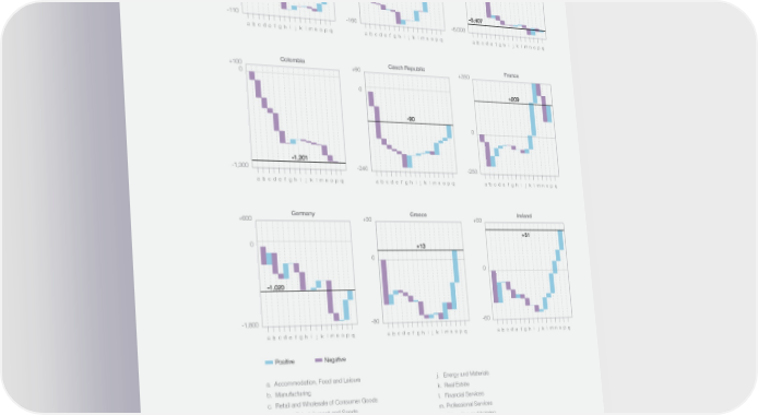 FIGURE 1.6 Change in employment by sector in selected countries (2019-2021) +30 Austria +60 Belgium +500 Brazil 0 +20 0 0 -53 (Thousands of jobs) Change in employment -5,407 -110 -160 -6,000 a b c d e f g h i j k l m n o p q a b c d e f g h i j k l m n o p q a b c d e f g h i j k l m n o p q +100 Colombia +60 Czech Republic +350 France 0 0 +209 -90 0 -1,201 -1,300 -240 -250 a b c d e f g h i j k l m n o p q a b c d e f g h i j k l m n o p q a b c d e f g h i j k l m n o p q +600 Germany +50 Greece +60 Ireland +51 0 +13 0 0 -1,020 -1,800 -80 -60 a b c d e f g h i j k l m n o p q a b c d e f g h i j k l m n o p q a b c d e f g h i j k l m n o p q Positive Negative a. Accommodation, Food and Leisure j. Energy and Materials b. Manufacturing k. Real Estate c. Retail and Wholesale of Consumer Goods l. Financial Services d. Media, Entertainment and Sports m. Professional Services e. Care, Personal Services and Wellbeing n. Education and training f. Agriculture and Natural Resources o. Health and Healthcare g. Supply Chain and Transportation p. Government and Public Sector h. Infrastructure q. Information Technology and Digital Communications i. Non-governmental and Membership Organisations Future of Jobs Report 2023 16