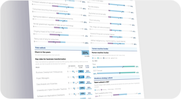 Industry Profile Global Employee (millions, ILO estimates) 1 / 2 Education and training 158.1 Trend outlook Global trends and their impact on job creation Technologies and their impact on job creation Trends most most likely to drive industry transformation and their expected impact job creation, ordered by net Technologies most most likely to drive industry transformation and their expected impact job creation, ordered effect (share of organizations surveyed) by net effect (share of organizations surveyed) Job creator Job displacer Net effect Global net effect Job creator Job displacer Net effect Global net effect Broader application of Environmental, Social and Governance (ESG) standards Education and workforce development technologies -100% +100% -100% +100% 64% 75% Broadening digital access Digital platforms and apps -100% +100% -100% +100% 52% 74% Increased adoption of new and frontier technologies Big-data analytics -100% +100% -100% +100% 44% 64% Consumers becoming more vocal on social issues Augmented and virtual reality -100% +100% -100% +100% 43% 50% Ageing populations in advanced and emerging economies Cloud computing -100% +100% -100% +100% 23% 46% Stricter government regulation of data use and technology Text, image, and voice processing -100% +100% -100% +100% 14% 41% Ongoing impact of the COVID pandemic Internet of things and connected devices -100% +100% -100% +100% -3% 38% Rising cost of living for consumers Artificial intelligence (e.g. machine learning, neural networks) -100% +100% -100% +100% -26% 36% Role outlook Human-machine frontier Churn in five years Human-machine frontier 2% Five-year structural labour-force churn (percent) Tasks performed by humans and machines today and in 2027 (share of total) Global 23% Human Machine Industry Frontier Global Frontier Key roles for business transformation ALL TASKS Roles most selected by organizations surveyed (as either growing, stable or declining), ordered by net role growth, and their net growth and structural churn (percent) Now NET GROWTH INDUSTRY GLOBAL ROLES -50% 0 50% CHURN CHURN 69% 32% 2027 Forecast 16% 24% Business Development Professionals 58% 42% 29% 25% Project Managers Workforce strategy outlook 14% 34% Data Analysts and Scientists Talent outlook in 2027 Expected change in talent availability, development and retention in the next five years (share of organizations surveyed) 14% 18% University and Higher Education Teachers Improving Worsening Global average Global average 12% 19% Software and Applications Developers Talent availability when hiring -100% +100% 29% 44% 16% 22% Special Education Teachers Talent development of existing workforce -100% +100% 4% 79% 27% 25% Vocational Education Teachers Talent retention of existing workforce 18% 31% Relationship Managers -100% +100% 15% 54% 20% 19% Accountants and Auditors Accounting, Bookkeeping and Payroll 26% 29% Clerks 47% 42% Data Entry Clerks 52% 35% Administrative and Executive Secretaries