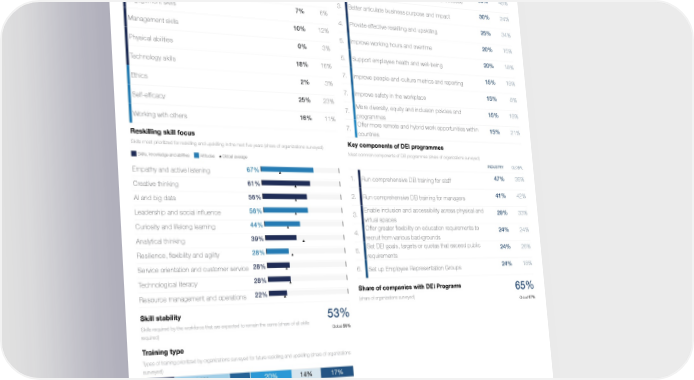 Industry Profile Global Employee (millions, ILO estimates) 2 / 2 Care, Personal Services and Wellbeing 114.4 6kill outlook Workforce strategy outlook Core skills )usiness practices to improve talent availability 6kills needed to perform well in key, stable roles within the company (share of organizations surveyed) Top practices with the greatest potential to improve talent availability (share of organizations surveyed) INDUSTRY G/2%$/ 6Nills NnoZledge and abilities $ttitudes 45% 22 2 . Oijer higher wages INDUSTRY G/2%$/ 35% 2. Improve talent progression and promotion processes 22% 2 Cognitive skills 30% 2 . Better articulate business purpose and impact 7% Engagement skills 25% . Provide eijective reskilling and upskilling 10% 2 Management skills 20% . Improve working hours and overtime 0% Physical abilities 20% . Support employee health and well-being 18% Technology skills 15% 7. Improve people-and-culture metrics and reporting 2% Ethics 15% 7. Improve safety in the workplace 25% 2 Self-eĴcacy More diversity, eTuity and inclusion policies and 15% 7. programmes 16 % Working with others Oijer more remote and hybrid work opportunities within 15% 2 7. countries 9eskilling skill focus Key components of +,0 programmes 6kills most prioritized for reskilling and upskilling in the next five years (share of organizations surveyed) 0ost common components of 'E, programmes (share of organizations surveyed) 6Nills NnoZledge and abilities $ttitudes Global average INDUSTRY G/2%$/ 67% Empathy and active listening 47% . Run comprehensive DEI training for staij 61% Creative thinking 41% 2 2. Run comprehensive DEI training for managers 56% AI and big data Enable inclusion and accessibility across physical and 56% 29% /eadership and social inIJuence . virtual spaces 44% Curiosity and lifelong learning Oijer greater IJexibility on education reTuirements to 24% 2 . recruit from various backgrounds 39% Analytical thinking Set DEI goals, targets or Tuotas that exceed public 24% 2 . 28% Resilience, IJexibility and agility reTuirements 28% Service orientation and customer service 24% . Set up Employee Representation Groups 28% Technological literacy :hare of companies ^ith +,0 7rograms 22% % Resource management and operations (share of organizations surveyed) Global % :kill stability 3% 6kills reTuired by the workforce that are expected to remain the same (share of all skills Global % reTuired) Training type Types of training prioritized by organizations surveyed for future reskilling and upskilling (share of organizations surveyed) 2 2 ROLES INDUSTRY G/2%$/ 14% Employer-sponsored apprenticeships 25% 2 Internal training departments 10% /icensed training from professional associations 20% 27 On-the-Mob training and coaching 14% 2 Private-sector online-learning platforms 17% 0 8niversities and other educational institutions