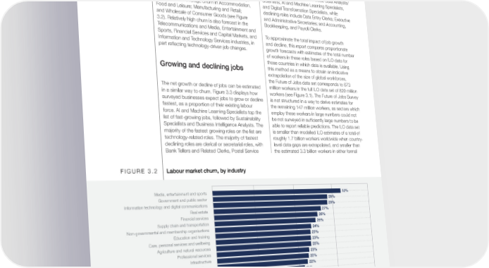 Future churn expectations for the next 5 years Clerks, and Cashiers and Ticket Clerks expected to are likely to continue the ongoing structural decline fastest. reconfiguration of labour markets. In Chapter 1, this report identified employment lagging behind Many of the roles which are forecast to be growing 2019 levels in Accommodation, Food and Leisure; and declining fastest, relative to their current Manufacturing; Retail and wholesale of consumer proportion in the labour force, are consistent with goods; Supply chain and transportation; and the findings published in previous Future of Jobs Media, Entertainment and Sports. This report’s reports in 2016, 2018 and 2020, signalling a churn analysis suggests a higher than average structural reconfiguration of labour-markets with its churn from 2023 to 2027 in the Supply Chain and roots in technological adoption and automation (see Transportation and Media, Entertainment and Sports Chapter 2). These emerging roles that have been industries, where respondents estimate structural highlighted in all four reports include Data Analysts/ five-year churn to be 29% and 32% respectively, Scientists, AI and Machine Learning Specialists, but lower than average churn in Accommodation, and Digital Transformation Specialists, while Food and Leisure; Manufacturing and Retail; declining roles include Data Entry Clerks; Executive and Wholesale of Consumer Goods (see Figure and Administrative Secretaries; and Accounting, 3.2). Relatively high churn is also forecast in the Bookkeeping, and Payroll Clerks. Telecommunications and Media, Entertainment and Sports, Financial Services and Capital Markets, and To approximate the total impact of job growth Information and Technology Services industries, in and decline, this report compares proportionate part reflecting technology-driven job changes. growth forecasts with estimates of the total number of workers in these roles based on ILO data for those countries in which data is available. Using Growing and declining jobs this method as a means to obtain an indicative extrapolation of the size of global workforces, the Future of Jobs data set corresponds to 673 The net growth or decline of jobs can be estimated million workers in the full ILO data set of 820 million in a similar way to churn. Figure 3.3 displays how workers (see Figure 3.1). The Future of Jobs Survey surveyed businesses expect jobs to grow or decline is not structured in a way to derive estimates for fastest, as a proportion of their existing labour the remaining 147 million workers, as sectors which force. AI and Machine Learning Specialists top the employ these workers in large numbers could not list of fast-growing jobs, followed by Sustainability be not surveyed in sufficiently large numbers to be Specialists and Business Intelligence Analysts. The able to report reliable predictions. The ILO data set majority of the fastest growing roles on the list are is smaller than modelled ILO estimates of a total of technology-related roles. The majority of fastest roughly 1.7 billion workers worldwide when country- declining roles are clerical or secretarial roles, with level data gaps are extrapolated, and smaller than Bank Tellers and Related Clerks, Postal Service the estimated 3.3 billion workers in either formal FIGURE 3.2 Labour market churn, by industry Media, entertainment and sports 32% Government and public sector 29% Information technology and digital communications 29% Real estate 27% Financial services 26% Supply chain and transportation 25% Non-governmental and membership organisations 24% Education and training 23% Care, personal services and wellbeing 23% Agriculture and natural resources 23% Professional services 23% Infrastructure 22% Health and healthcare 22% Retail and wholesale of consumer goods 21% Energy and materials 19% Manufacturing 19% Automotive and aerospace 19% Accommodation, Food and Leisure 16% 0 10 20 30 40 Five-year churn (%) Source Source World Economic Forum, Future of Jobs Survey 2023. Labour-market churn refers to the total expected job movement - including both new roles being created and existing roles destroyed - as a proportion of current employment. This excludes situations where a new employee replaces someone in the same role. Future of Jobs Report 2023 29