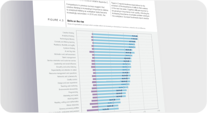 global rate – trends which are reversed in non- number of surveyed companies that considered governmental and membership organizations. analytical thinking to be a core skill outnumbered Agriculture, Forestry and Fishing ranks as an those considering creative thinking to be a core skill outlier due to the sector’s focus on environmental by a margin of 35% and 38%, respectively. That stewardship and its growing outlook for the gap has now decreased to 21% and may continue importance of manual dexterity, endurance to close. As reported in Chapter 2, companies and precision and resource management skills. expect the automation of reasoning and decision- Environmental stewardship skills are also notably making to increase by 9% by 2027. important in the Chemical and Advanced Materials industry, alongside leadership and social influence. The Electronics and Education and Training Skill evolution 2023–2027 industries are united by an emphasis on the importance of systems thinking to their workers. These trends may be viewed in detail in Appendix C. Figure 4.3 reports business expectations for the evolution of the importance of skills to their workers Comparisons to previous surveys suggest that in the next five years. Cognitive skills are reported to creative thinking is increasing in importance relative be growing in importance most quickly, reflecting the to analytical thinking as workplace tasks become increasing importance of complex problem-solving in increasingly automated. In 2018 and 2020, the the workplace. Surveyed businesses report creative FIGURE 4.3 Skills on the rise Share of organizations surveyed which consider skills to be increasing or decreasing in importance, ordered by the net difference. Creative thinking 73.2% Analytical thinking 71.6% Technological literacy 67.7% Curiosity and lifelong learning 66.8% Resilience, flexibility and agility 65.8% Systems thinking 59.9% AI and big data 59.5% Motivation and self-awareness 58.9% Talent management 56.4% Service orientation and customer service 54.8% Leadership and social influence 53.1% Empathy and active listening 52.3% Dependability and attention to detail 52.0% Resource management and operations 51.4% Networks and cybersecurity 50.3% Quality control 49.5% Design and user experience 48.4% Teaching and mentoring 47.8% Environmental stewardship 43.2% Programming 38.8% Marketing and media 38.4% Multi-lingualism 38.0% Reading, writing and mathematics 26.4% Global citizenship 23.8% Sensory-processing abilities 22.6% Manual dexterity, endurance and precision 14.9% -25 0 +25 +50 +75 +100 Share of companies surveyed (%) Increasing importance Declining importance Net difference: Skills, knowledge and abilities Attitudes Source Note World Economic Forum, Future of Jobs Survey 2023. The Future of Jobs Survey uses the World Economic Forum's Global Skills Taxonomy. The share of companies which consider skills to be of stable importance to their workers is not plotted. Future of Jobs Report 2023 39
