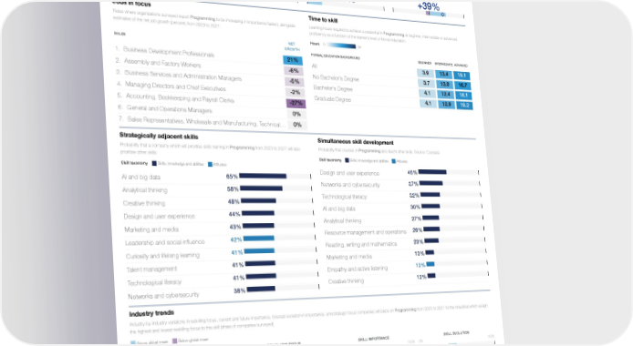 Skill Profile Reskilling Ranking Programming 20th Skills, knowledge and abilities Technology skills Programming Global Skills Taxonomy / / Five year trend Reskilling focus Skill importance Skill evolution Learning hours spent pursuing assessements and Companies for which Programming is a priority in Companies for which Programming is a core skill Share of companies for which Programming is credentials in Programming from 2017 to 2022 their upskilling and reskilling programmes for 2023- for workers (share of companies surveyed) increasing or decreasing in importance at work. (share of total learning hours). Source: Coursera 2027 (share of companies surveyed) White diamond and label represent net share. 20% 13% 19% +39% 0% 2017 2022 Jobs in focus Time to skill Roles where organizations surveyed report Programming to be increasing in importance fastest, alongside Learning hours required to achieve a credential in Programming at beginner, intermediate or advanced estimates of the net job growth (percent) from 2023 to 2027. proficiency as a function of the learner’s level of formal education. Hours 0 34 NET ROLES GROWTH FORMAL EDUCATION BACKGROUND BEGINNER INTERMEDIATE ADVANCED 21% 1. Business Development Professionals 3.9 13.4 19.1 All -6% 2. Assembly and Factory Workers 3.7 13.0 16.7 No Bachelor's Degree -5% 3. Business Services and Administration Managers 4.1 12.4 18.1 Bachelor's Degree -2% 4. Managing Directors and Chief Executives 4.1 12.9 19.2 Graduate Degree -27% 5. Accounting, Bookkeeping and Payroll Clerks 0% 6. General and Operations Managers 0% 7. Sales Representatives, Wholesale and Manufacturing, Technical … Strategically adjacent skills Simultaneous skill development Probability that a company which will prioritise skills training in Programming from 2023 to 2027 will also Probability that courses in Programming also teach other skills. Source: Coursera. prioritise other skills. Skill taxonomy Skills, knowledge and abilities Attitudes Skill taxonomy Skills, knowledge and abilities Attitudes 45% Design and user experience 65% AI and big data 37% Networks and cybersecurity 58% Analytical thinking 32% Technological literacy 48% Creative thinking 30% AI and big data 44% Design and user experience 27% Analytical thinking 43% Marketing and media 26% Resource management and operations 42% Leadership and social influence 23% Reading, writing and mathematics 41% Curiosity and lifelong learning 13% Marketing and media 41% Talent management 12% Empathy and active listening 41% Technological literacy 12% Creative thinking 38% Networks and cybersecurity Industry trends Industry-by-industry variations in reskilling focus, current and future importance, forecast evolution in importance, and strategic focus companies will place on Programming from 2023 to 2027 for the industries which assign the highest and lowest reskilling focus to this skill (share of companies surveyed) Above global mean Below global mean RESKILLING FOCUS SKILL IMPORTANCE SKILL EVOLUTION INDUSTRY 0% 100% 0% 100% 0% 100% Information and technology services Media, Entertainment and Sports Telecommunications Business support and premises maintenance services Agriculture, forestry, and fishing Real estate