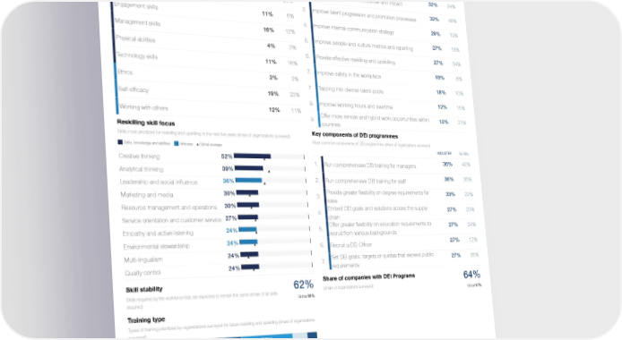 Industry Profile Global Employee (millions, ILO estimates) 2 / 2 Accommodation, Food, and Leisure 18.6 6kill outlook Workforce strategy outlook Core skills )usiness practices to improve talent availability 6kills needed to perform well in key, stable roles within the company (share of organizations surveyed) Top practices with the greatest potential to improve talent availability (share of organizations surveyed) INDUSTRY G/2%$/ 6Nills NnoZledge and abilities $ttitudes 35% 2 2 . Oijer higher wages INDUSTRY G/2%$/ 32% 2 2. Better articulate business purpose and impact 25% 2 Cognitive skills 32% 2. Improve talent progression and promotion processes 11% Engagement skills 29% . Improve internal-communication strategy 16% 2 Management skills 27% . Improve people-and-culture metrics and reporting 4% Physical abilities 27% . Provide eijective reskilling and upskilling 11% Technology skills 18% 7. Improve safety in the workplace 2% Ethics 18% 0 7. Tapping into diverse talent pools 19% 2 Self-eĴcacy 12% . Improve working hours and overtime 12 % Working with others Oijer more remote and hybrid work opportunities within 12% 2 . countries 9eskilling skill focus Key components of +,0 programmes 6kills most prioritized for reskilling and upskilling in the next five years (share of organizations surveyed) 0ost common components of 'E, programmes (share of organizations surveyed) 6Nills NnoZledge and abilities $ttitudes Global average INDUSTRY G/2%$/ 52% Creative thinking 36% 2 . Run comprehensive DEI training for managers 39% Analytical thinking 36% 2. Run comprehensive DEI training for staij 36% /eadership and social inIJuence Provide greater IJexibility on degree reTuirements for 30% 33% 22 Marketing and media . roles 30% Resource management and operations Embed DEI goals and solutions across the supply 27% 2 . chain 27% Service orientation and customer service Oijer greater IJexibility on education reTuirements to 27% 2 . 24% Empathy and active listening recruit from various backgrounds 24% Environmental stewardship 27% 2 . Recruit a DEI OĴcer 24% Multi-lingualism Set DEI goals, targets or Tuotas that exceed public 27% 2 7. 24% reTuirements 4uality control :hare of companies ^ith +,0 7rograms 6% :kill stability 6% (share of organizations surveyed) 6kills reTuired by the workforce that are expected to remain the same (share of all skills Global % Global % reTuired) Training type Types of training prioritized by organizations surveyed for future reskilling and upskilling (share of organizations surveyed) 2 2 ROLES INDUSTRY G/2%$/ 17% Employer-sponsored apprenticeships 27% 2 Internal training departments 13% /icensed training from professional associations 28% 27 On-the-Mob training and coaching 8% 2 Private-sector online-learning platforms 5% 0 8niversities and other educational institutions