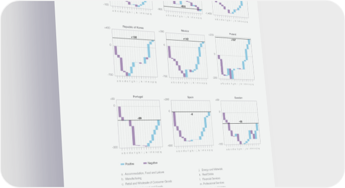 FIGURE 1.6 Change in employment by sector in selected countries (2019-2021) +30 Israel +100 Italy +600 Japan 0 0 -10 0 -90 Change in employment(Thousands of jobs) -805 -100 -900 -1,400 a b c d e f g h i j k l m n o p q a b c d e f g h i j k l m n o p q a b c d e f g h i j k l m n o p q +400 Republic of Korea +300 Mexico +200 Poland +142 +187 +150 0 0 0 -700 -700 -250 a b c d e f g h i j k l m n o p q a b c d e f g h i j k l m n o p q a b c d e f g h i j k l m n o p q +50 Portugal +200 Spain +60 Sweden 0 0 0 -6 -99 -55 -300 -600 -160 a b c d e f g h i j k l m n o p q a b c d e f g h i j k l m n o p q a b c d e f g h i j k l m n o p q Positive Negative a. Accommodation, Food and Leisure j. Energy and Materials b. Manufacturing k. Real Estate c. Retail and Wholesale of Consumer Goods l. Financial Services d. Media, Entertainment and Sports m. Professional Services e. Care, Personal Services and Wellbeing n. Education and training f. Agriculture and Natural Resources o. Health and Healthcare g. Supply Chain and Transportation p. Government and Public Sector h. Infrastructure q. Information Technology and Digital Communications i. Non-governmental and Membership Organisations Future of Jobs Report 2023 17
