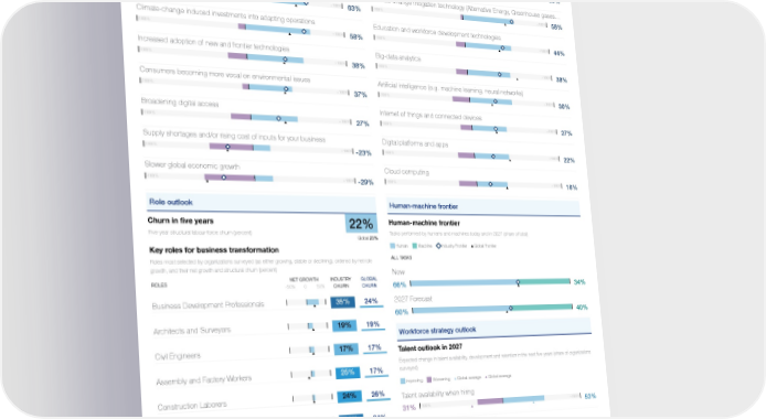 Industry Profile Global Employee (millions, ILO estimates) 1 / 2 Infrastructure 183.9 Trend outlook Global trends and their impact on job creation Technologies and their impact on job creation Trends most most likely to drive industry transformation and their expected impact job creation, ordered by net Technologies most most likely to drive industry transformation and their expected impact job creation, ordered effect (share of organizations surveyed) by net effect (share of organizations surveyed) Job creator Job displacer Net effect Global net effect Job creator Job displacer Net effect Global net effect Broader application of Environmental, Social and Governance (ESG) standards Environmental management technologies (e.g. pollution abatement, recycling) -100% +100% -100% +100% 67% 60% Investments to facilitate the green transition of your business Climate-change mitigation technology (Alternative Energy, Greenhouse gases … -100% +100% -100% +100% 63% 58% Climate-change induced investments into adapting operations Education and workforce development technologies -100% +100% -100% +100% 58% 44% Increased adoption of new and frontier technologies Big-data analytics -100% +100% -100% +100% 38% 38% Consumers becoming more vocal on environmental issues Artificial intelligence (e.g. machine learning, neural networks) -100% +100% -100% +100% 37% 30% Broadening digital access Internet of things and connected devices -100% +100% -100% +100% 27% 27% Supply shortages and/or rising cost of inputs for your business Digital platforms and apps -100% +100% -100% +100% -23% 22% Slower global economic growth Cloud computing -100% +100% -100% +100% -29% 16% Role outlook Human-machine frontier Churn in five years Human-machine frontier 22% Five-year structural labour-force churn (percent) Tasks performed by humans and machines today and in 2027 (share of total) Global 23% Human Machine Industry Frontier Global Frontier Key roles for business transformation ALL TASKS Roles most selected by organizations surveyed (as either growing, stable or declining), ordered by net role growth, and their net growth and structural churn (percent) Now NET GROWTH INDUSTRY GLOBAL ROLES -50% 0 50% CHURN CHURN 66% 34% 2027 Forecast 35% 24% Business Development Professionals 60% 40% 19% 19% Architects and Surveyors Workforce strategy outlook 17% 17% Civil Engineers Talent outlook in 2027 Expected change in talent availability, development and retention in the next five years (share of organizations surveyed) 25% 17% Assembly and Factory Workers Improving Worsening Global average Global average 24% 26% Construction Laborers Talent availability when hiring -100% +100% 31% 53% 32% 24% Technical Specialists Talent development of existing workforce -100% +100% 2% 86% 16% 17% Managing Directors and Chief Executives Talent retention of existing workforce 18% 14% General and Operations Managers -100% +100% 13% 56% 13% 19% Accountants and Auditors Accounting, Bookkeeping and Payroll 14% 29% Clerks 43% 42% Data Entry Clerks 36% 35% Administrative and Executive Secretaries