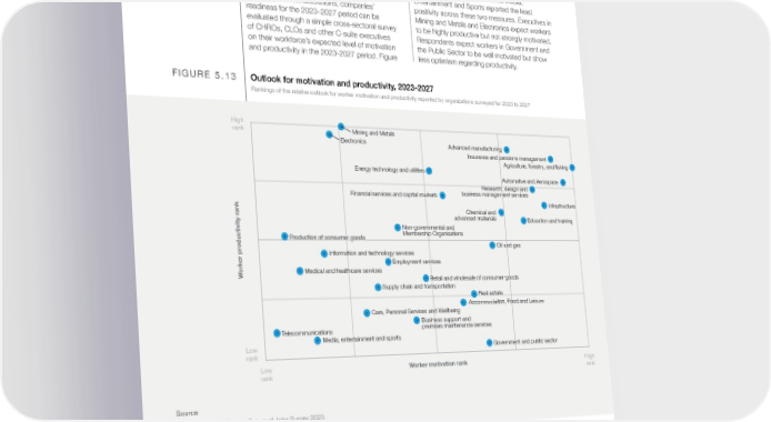 over the 2023–2027 period. In general, most 5.13 ranks industries’ expected performance on workers will need to be trained during this period. motivation and productivity, based on the net Roughly half of those can currently be trained, difference between the share of companies in each but Human Resources functions will have to sector that foresee a positive outlook minus those accelerate their current plans if the remaining that foresee a negative outlook. workers’ skills gaps are to be closed. Companies seldom expect external funding for training and will Survey results suggest that the strongest avail themselves of external training solutions far performance may be expected in Advanced less frequently than looking to internal solutions, Manufacturing; Insurance and Pensions especially via on-the-job training and coaching. Management; and Agriculture, Forestry and Most training programmes will be short, and a Fishing. Surveyed companies operating return on investment is expected within a year. in Telecommunications as well as Media, Entertainment and Sports reported the least Beyond these considerations, companies’ positivity across these two measures. Executives in readiness for the 2023–2027 period can be Mining and Metals and Electronics expect workers evaluated through a simple cross-sectoral survey to be highly productive but not strongly motivated. of CHROs, CLOs and other C-suite executives Respondents expect workers in Government and on their workforce’s expected level of motivation the Public Sector to be well motivated but show and productivity in the 2023-2027 period. Figure less optimism regarding productivity. FIGURE 5.13 Outlook for motivation and productivity, 2023-2027 Rankings of the relative outlook for worker motivation and productivity reported by organizations surveyed for 2023 to 2027 High rank Mining and Metals Electronics Advanced manufacturing Insurance and pensions management Agriculture, forestry, and fishing Energy technology and utilities Automotive and Aerospace Research, design and Financial services and capital markets business management services k Infrastructure n Chemical and a r advanced materials Education and training y t i v Non-governmental and i t Membership Organisations c Production of consumer goods u d Oil and gas o r p Information and technology services r e Employment services k r Medical and healthcare services Wo Retail and wholesale of consumer goods Supply chain and transportation Real estate Accommodation, Food and Leisure Care, Personal Services and Wellbeing Business support and Telecommunications premises maintenance services Media, entertainment and sports Low Government and public sector rank Low Worker motivation rank High rank rank Source World Economic Forum, Future of Jobs Survey 2023. Future of Jobs Report 2023 60