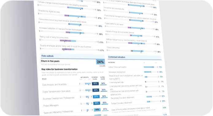 Economy Profile Working Age Population (Millions) 1 / 2 Thailand 48.0 Trend outlook Global trends and their impact on job creation Technologies and their impact on job creation Trends most most likely to drive industry transformation and their expected impact job creation, ordered by net Technologies most most likely to drive industry transformation and their expected impact job creation, ordered effect (share of organizations surveyed) by net effect (share of organizations surveyed) Job creator Job displacer Net effect Global net effect Job creator Job displacer Net effect Global net effect Investments to facilitate the green transition of your business Big-data analytics -100% +100% -100% +100% 58% 67% Broader application of Environmental, Social and Governance (ESG) standards Climate-change mitigation technology (Alternative Energy, Greenhouse gases … -100% +100% -100% +100% 50% 64% Climate-change induced investments into adapting operations Encryption and cybersecurity -100% +100% -100% +100% 50% 55% Broadening digital access Environmental management technologies (e.g. pollution abatement, recycling) -100% +100% -100% +100% 47% 54% Consumers becoming more vocal on environmental issues Digital platforms and apps -100% +100% -100% +100% 40% 48% Increased adoption of new and frontier technologies Internet of things and connected devices -100% +100% -100% +100% 38% 41% Rising cost of living for consumers Artificial intelligence (e.g. machine learning, neural networks) -100% +100% -100% +100% -15% 40% Supply shortages and/or rising cost of inputs for your business Cloud computing -100% +100% -100% +100% -17% 38% Role outlook Contextual indicators Churn in five years INDICATORS 0% 100% 24% Five-year structural labour-force churn (percent) Global 23% Labour force participation 72% Key roles for business transformation Roles most selected by organizations surveyed (as either growing, stable or declining), ordered by net role Vulnerable employment 48% growth, and their net growth and structural churn (percent) Share of youth not in employment, education, or NET GROWTH ECONOMY GLOBAL 15% ROLES -50% 0 50% CHURN CHURN training (NEET) Unemployment rate 1% 43% 34% Data Analysts and Scientists Unemployment rate among workers with basic 1% edu. 42% 32% Digital Transformation Specialists Unemployment rate among workers with 1% advanced edu. 27% 24% Business Development Professionals Secondary Education Attainment 35% 32% 25% Project Managers Tertiary Education Attainment 20% 14% 21% Sales and Marketing Professionals Ease of finding skilled employees in local labour market 4.59 1=Companies cannot easily find skilled employees, 7=Companies can easily find skilled employees Business Services and Administration 22% 22% Fill vacancies by hiring foreign labour Managers 4.18 1=Companies cannot fill vacancies by hiring foreign labour, 7=Companies can fill vacancies by hiring foreign labour 26% 14% General and Operations Managers Country investment in mid-career training 3.29 1=Government does not invest in mid-career training, 7=Government invests in mid-career training 10% 19% Accountants and Auditors Workers' Rights Index 5 17% 17% Assembly and Factory Workers 5+=No guarantee of rights due to the breakdown of the rule of law, 1=Sporadic violations of rights Level of National Compliance with Labour Rights Accounting, Bookkeeping and Payroll 22% 29% NA 10=The worst possible score, lower levels of compliance, 0=The best possible score, higher levels of Clerks compliance 38% 35% Administrative and Executive Secretaries