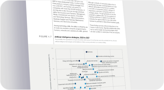 This edition of the Future of Jobs Report aims to technological literacy skills, and design and user offer granularity on technology skills, particularly experience by some margin. In the next five years, the priorities companies assign to training workers AI and big data will comprise more than 40% of to work with AI and big data, as well as attitudes the technology training programmes undertaken and other socio-emotional factors. The next section in surveyed companies operating in the United addresses AI and big data skills and the final States, China, Brazil and Indonesia. The next most section of this chapter addresses attitudes, such as emphasized technology skill is design and user self-efficacy, working with others and ethics. experience, though this receives less than half the strategic prioritization of AI and big data in most countries and industries, and only exceeds it in AI and big data Spain and Latvia, among the countries covered by this year’s survey. While AI and big data ranks only 15th as a core Although a minority of companies believe that AI skill for mass employment today, it is the number and big data has been overemphasized as a core three priority in company training strategies from skill and will decline in importance to workers, now until 2027, and number one priority for a net 59% of companies predict it will grow in companies with more than 50,000 employees. AI importance, and many companies see it as a and big data is also the most strongly prioritized strategic priority. Though generative AI has the skill in the Insurance and Pensions; Management, potential to displace jobs, the focus placed on Media, Entertainment and Sports; Information training workforces to exploit AI and big data and Technology Services; Telecommunications; indicates the opportunities for new roles which Business Support and Premises Maintenance harness its potential to help achieve business goals. Services; and Electronics industries. These findings are also reflected elsewhere in the Among technology skills, the ability to efficiently use Future of Jobs Survey. Big-data analytics also ranks AI tools now exceeds computer programming by top by some margin among technologies which humans, networks and cybersecurity skills, general are seen as likely to create jobs if they are adopted, FIGURE 4.7 Artificial intelligence strategies, 2023 to 2027 The probability that organizations surveyed will prioritise skills training in AI and big data versus the probability that they will adopt artificial-intelligence technologies and the likelihood of them pursuing automation as a business strategy 100 Electronics Information and technology services 90 Energy technology and utilities Employment services Insurance and pensions management Automotive and aerospace Media, entertainment and sports Research, design and business Financial services and capital markets management services Business support and premises maintenance services 80 Telecommunications Oil and gas Chemical and advanced materials Medical and Education and training healthcare services Advanced manufactoring 70 Infrastructure Care, personal services and wellbeing Production of consumer goods Non-governmental and membership organisations Government and public sector Retail and wholesale of consumer goods Agriculture, Forestry Supply chain and transportation 60 and Fishing Real estate e of businesses which plan to adopt AI technologies (%)Mining and metals Shar Accommodation, Food and Leisure 50 0 20 40 60 80 100 Share of businesses which plan to prioritise skills training in AI and big data (%) Share of businesses which plan to accelerate automation 60 to 70% 70 to 80% 80 to 90% 90 to 100% Source World Economic Forum, Future of Jobs Survey 2023. Future of Jobs Report 2023 46