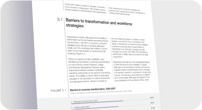 May 2023 Future of Jobs Report 2023 5 Workforce strategies Faced with a labour market in transition, industries face, exploring the workforce strategies and must transform to keep pace. This chapter reviews practices that organizations expect to implement to the key barriers to transformation that organizations achieve their business goals. 5.1 Barriers to transformation and workforce strategies Organizations identify skills gaps and an inability to the most significant barrier. In addition to these attract talent as the key barriers preventing industry barriers, over half (52.2%) of companies in the transformation, with 60% of surveyed companies Media, Entertainment and Sports industry highlight highlighting the difficulty in bridging skills gaps insufficient understanding of opportunities by locally and 53% identifying their inability to attract leadership as an obstacle. Company size also talent as the main barriers to transforming their emerges as a factor, with SMEs 20% less likely to business (Figure 5.1). identify lack of skilled talent as a barrier than large corporations. These two aspects of talent availability were identified as top barriers to business transformation Businesses see talent as more strategically limiting by every industry except Research, Design to their performance than availability of capital: and Business Management Services, where skills gaps in the local labour market were seen as respondents ranked outdated or inflexible a greater barrier to transformation than a shortage regulatory frameworks as the second most limiting of investment capital by companies in virtually every barrier. The inability to attract talent is particularly industry. The picture is more polarized at regional prevalent in the Electronics as well as Automotive and country levels. Skills gaps are reported to be and Aerospace sectors, where it is ranked as most problematic in Sub-Saharan Africa, where FIGURE 5.1 Barriers to business transformation, 2023-2027 Share of organizations surveyed expecting these factors will limit the transformation of their business 1. Skills gaps in the local labour market 59.7% 2. Inability to attract talent 53.4% 3. Outdated or inflexible regulatory framework 41.9% 4. Skills gaps among the organization’s leadership 37.3% 5. Shortage of investment capital 37.2% 6. Insufficient understanding of opportunities 32.6% Source World Economic Forum, Future of Jobs Survey 2023. Future of Jobs Report 2023 49
