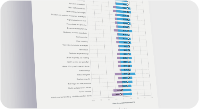 FIGURE 2.5 Expected impact of technology adoption on jobs, 2023–2027 Share of organizations surveyed that expect each technology to create or displace jobs, ordered by the job creation net effect. The shares of organizations which expect the impact of adopting these technologies to be neutral are not plotted. Big-data analytics 58.0% Climate-change mitigation technology 49.5% Environmental management technologies 45.8% Encryption and cybersecurity 43.3% Biotechnology 42.9% Agriculture technologies 41.3% Digital platforms and apps 41.0% Health and care technologies 40.3% Education and workforce development technologies 39.8% Augmented and virtual reality 39.6% Power storage and generation 37.6% E-commerce and digital trade 36.6% Biodiversity protection technologies 35.0% Cryptocurrencies 35.1% Cloud computing 34.8% Water-related adaptation technologies 33.7% New materials 32.9% Distributed ledger technology 30.5% 3D and 4D printing and modelling 28.8% Satellite services and space flight 28.5% Internet of things and connected devices 28.1% Nanotechnology 28.0% Artificial intelligence 25.6% Quantum computing 23.5% Text, image, and voice processing 17.6% Electric and autonomous vehicles 16.5% Robots, humanoid -2.6% Robots, non-humanoid (e.g. industrial automation, drones) -8.8% -100 -75 -50 -25 0 25 50 75 100 Share of organizations surveyed (%) Job creator Job displacer Net effect Source World Economic Forum, Future of Jobs Survey 2023. Future of Jobs Report 2023 25