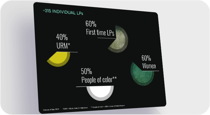 ~315 INDIVIDUAL LPs 60% First time LPs 40% URM* 60% Women 50% People of color** Data as of Sep 2021 *URM = Black, Latin & Indigenous ** People of color = URM + Asian & Middle Eastern
