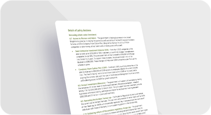 Details of policy decisions Increasing private sector investment 4.7 Access to finance and talent – The government is helping businesses in the United Kingdom to grow by increasing the generosity and availability of the Seed Enterprise Investment Scheme and the Company Share Option Plan, designed to improve the ability of British companies to raise money, attract talent and ultimately grow and succeed. • Seed Enterprise Investment Scheme (SEIS) – From April 2023, companies will be able to raise up to £250,000 of SEIS investment, a two-thirds increase. To enable more companies to use SEIS, the gross asset limit will be increased to £350,000 and the age limit from 2 to 3 years. To support these increases, the annual investor limit will be doubled to £200,000. These changes will help over 2,000 companies a year that use the scheme to grow. • Company Share Option Plan (CSOP) – From April 2023, qualifying companies will be able to issue up to £60,000 of CSOP options to employees, double the current £30,000 limit. The ‘worth having’ restriction on share classes within CSOP will be eased, better aligning the scheme rules with the rules in the Enterprise Management Incentive scheme and widening access to CSOP for growth companies. 4.8 Annual Investment Allowance – The government will support UK businesses by making the temporary £1 million level of the Annual Investment Allowance permanent, instead of letting it fall to £200,000 after 31 March 2023. This will support business investment, provide businesses with more stability, and make tax simpler for any business investing between £200,000 and £1 million in plant and machinery. 4.9 Removing the bankers’ bonus cap – The Prudential Regulation Authority will remove the current cap to bankers’ bonuses. This cap limits remuneration of certain bank staff to 100% of their fixed pay (or 200% with shareholder approval). Pay in bonuses aligns the incentives of individuals with those of the bank, in turn supporting growth in the UK economy. 4.10 Delivering reform of the pensions regulatory charge cap – The government will bring forward draft regulations to remove well-designed performance fees from the occupational defined contribution pension charge cap, ensuring that savers benefit from higher potential investment returns while providing clarity for institutional investors to help unlock investment into of the UK’s most innovative businesses and productive assets. 4.11 Unlocking institutional investment into innovative UK Scale Ups – The government will launch the Long-term Investment for Technology & Science (LIFTS) competition, providing up to £500 million to support new funds designed by institutional investors and world-class fund managers, aiming to crowd billions of pounds of private investment into UK science and technology businesses. Following a short period of industry engagement led by the British Business Bank, the government will launch a call for proposals by the end of the year to identify promising fund structures and vehicles, with the intention that funds go live as soon as possible next year. 4.12 Investment Zones – The government will work with the devolved administrations and local partners to introduce Investment Zones across the UK. Investment Zones aim to drive growth and unlock housing. Areas with Investment Zones will benefit from tax incentives, planning liberalisation, and wider support for the local economy. The Growth Plan 2022 28