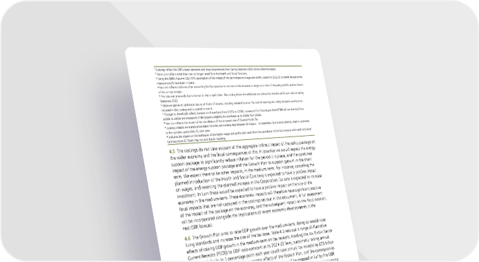 1 Costings reflect the OBR’s latest economic and fiscal determinants from Spring Statement 2022 unless otherwise stated. 2 Gross cost reflects total direct tax no longer raised from the Health and Social Care Levy. 3 Using the OBR’s Autumn 2021 EFO assumption of the impact of the tax increase on wages and profits, scaled for 2022-23 to match the period the measure would have been in place. 4 Net cost reflects total cost after accounting for the reduction in cost due to the increases to wages as a result of the policy and the positive impact of this on tax receipts. 5 The rate was previously due to be cut to 19p in April 2024. This costing shows the additional cost above that decision which was made at Spring Statement 2022. 6 Measure applies to additional rate on all forms of income, including dividend income. The cost of reversing the 1.25pp dividend rate rise is not included in this costing and is covered in row 4. 7 Changes to thresholds reflect: increase to nil rate band from £125k to £250k, increase to First Time Buyers Relief (FTBR) nil-rate threshold from £300k to £425k and increase to FTBR property eligibility for purchases up to £625k from £500k. 8 Net cost reflects the impact of the cancellation of the increased rate of Diverted Profits Tax. 9 Costing is based on market prices taken from the ten working days between 29 August - 12 September. Due to price volatility, there is uncertainty in the numbers, particularly for later years. 10 Includes the impact on the Exchequer of the higher wages and profits that result from the cancellation of the NICs increase and Health and Social Care Levy (row 2). Totals may not sum due to rounding. 4.5 The costings do not take account of the aggregate indirect impact of the policy package on the wider economy and the fiscal consequences of this. In practice we would expect the energy support package to significantly reduce inflation for the period it is place, and the combined impact of the energy support package and the Growth Plan to support growth in the short term. We expect there to be other impacts, in the medium term. For instance, cancelling the planned introduction of the Health and Social Care Levy is expected to have a positive impact on wages, and reversing the planned increase in the Corporation Tax rate is expected to increase investment. In turn these would be expected to have a positive impact on the size of the economy in the medium-term. These economic impacts will therefore have significant positive fiscal impacts that are not captured in the costings set out in this document. A full assessment of the impact of the package on the economy, and the subsequent impact on the fiscal position, will be incorporated alongside the implications of recent economic developments in the next OBR forecast. 4.6 The Growth Plan aims to raise GDP growth over the medium-term, doing so would raise living standards and increase the size of the tax base. Table 4.3 sets out a range of illustrative effects of raising GDP growth in the medium-term on tax receipts. Holding the tax (Public Sector Current Receipts (PSCR)) to GDP ratio constant at its 2021-22 level, sustainably raising annual GDP growth by ½ to 1 percentage point each year could raise annual tax receipts by £23 billion to £47 billion by the fifth year. The economic effects of the Growth Plan, and the consequences for tax receipts, spending, government borrowing and debt, will be assessed in full by the OBR when they publish a forecast before the end of 2022. Previous OBR analysis suggests that raising real GDP growth to 2-3% a year over three years, from a base growth forecast of 1.6% per year for those three years, could provide a benefit to the public finances of £10-40 billion through a 2 range of effects across tax and spending. 1 Table 4.3: Illustrative effects on tax receipts of higher GDP growth Annual extra GDP growth each Change in cumulative GDP Annual tax receipts benefit from year for 5 years growth after 5 years GDP increase by the 5th year (£ billion) 0.00% 0.0% 0 0.25% 1.3% 11 0.50% 2.5% 23 0.75% 3.8% 35 1.00% 5.1% 47 1 The figures in Table 4.3 are purely illustrative; they do not provide an assessment of what effect the policy package will have. Table 4.3 assumes the PSCR to nominal GDP ratio is held at its 2021-22 outturn level of 38.5% and only shows the potential effects of a larger economy on tax receipts, assuming the structure of the economy and tax system do not change. The additional annual GDP growth is assumed to be an increase in trend growth. Increases in trend growth may only occur over the medium term. The OBR’s March forecast projected annual GDP growth of 1.9% on average over the next five fiscal years. Changes in the outlook for GDP growth will depend on other forces affecting the economy as well as changes to government policy. The illustrative receipts effect is rounded to the nearest £ billion. There would be a range of other effects in the public finances from faster economic growth, some of which might reduce government spending, while others could push spending higher. 2 Office for Budget Responsibility analysis, January 2022. The Growth Plan 2022 27