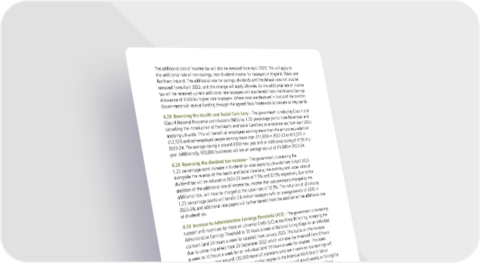 The additional rate of income tax will also be removed from April 2023. This will apply to the additional rate of non-savings, non-dividend income for taxpayers in England, Wales and Northern Ireland. The additional rate for savings, dividends and the default rates will also be removed from April 2023, and this change will apply UK-wide. As the additional rate of income tax will be removed current additional rate taxpayers will also benefit from the Personal Savings Allowance of £500 for higher rate taxpayers. Where rates are devolved in Scotland the Scottish Government will receive funding through the agreed fiscal framework to allocate as they see fit. 4.28 Reversing the Health and Social Care Levy – The government is reducing Class 1 and Class 4 National Insurance contributions (NICs) by 1.25 percentage points from November and cancelling the introduction of the Health and Social Care Levy as a separate tax from April 2023, applying UK-wide. This will benefit all employees earning more than the annual equivalent of £12,570 and self-employed people earning more than £11,909 in 2022-23 or £12,570 in 2023-24. The average saving is around £330 next year and an additional saving of £135 this year. Additionally, 920,000 businesses will see an average tax cut of £9,600 in 2023-24. 4.29 Reversing the dividend tax increase – The government is reversing the 1.25 percentage point increase in dividend tax rates applying UK-wide from 6 April 2023. Alongside the reversal of the Health and Social Care Levy, the ordinary and upper rates of dividend tax will be reduced to 2021-22 levels of 7.5% and 32.5% respectively. Due to the abolition of the additional rate of income tax, income that was previously charged at the additional rate, will now be charged at the upper rate of 32.5%. The reduction of all rates by 1.25 percentage points will benefit 2.6 million taxpayers with an average benefit of £345 in 2023-24; and additional rate payers will further benefit from the abolition of the additional rate of dividend tax. 4.30 Increase to Administrative Earnings Threshold (AET) – The government is increasing support and incentives for those on Universal Credit (UC) across Great Britain by increasing the Administrative Earnings Threshold to 15 hours a week at National Living Wage for an individual claimant (and 24 hours a week for couples) from January 2023. This builds on the increase due to come into effect from 26 September 2022 which will raise the threshold from 9 hours a week to 12 hours a week for an individual (and 19 hours a week for couples). This latest change means that around 120,000 more UC claimants who are in work on low earnings will be moved from the Light Touch labour market regime to the Intensive Work Search labour market regime. They will be expected to actively search for work and attend weekly or fortnightly appointments at a jobcentre in order to secure more or better paid work, or they could have their benefits reduced. These changes will apply across Great Britain. In line with usual practice, the government will work with the Northern Ireland Civil Service to determine the most suitable arrangements for Northern Ireland in due course. 4.31 Strengthening the Universal Credit (UC) sanctions regime – Alongside these changes to the AET, the government will be strengthening the sanctions regime to set clear work expectations – including applying for jobs, attending interviews or increasing the hours – in return for receiving UC. Claimants who do not fulfil their job-search commitment without good reason could have their benefits reduced. These changes will apply across Great Britain. In line with usual practice, the government will work with the Northern Ireland Civil Service to determine the most suitable arrangements for Northern Ireland in due course. 4.32 Expansion of DWP 50+ offer – To help older workers to find work, the government will provide additional work coach support to new, eligible over 50s claimants and – for the first time – to over 50s that are long-term unemployed. This will mean more jobseekers across Great Britain receive intensive, tailored support at jobcentres to help them get into and progress in work, boosting their earnings ahead of retirement. In line with usual practice, the government will work with the Northern Ireland Civil Service to determine the most suitable arrangements for Northern Ireland in due course. The Growth Plan 2022 31