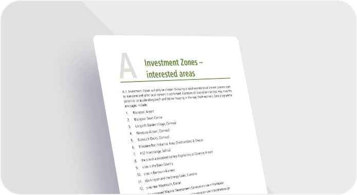 A Investment Zones – interested areas A.1 Investment Zones will only be chosen following a rapid expression of interest process open to everyone and after local consent is confirmed. Examples of illustrative sites that may have the potential to accelerate growth and deliver housing in the way the Investment Zone programme envisages include: 1. Blackpool Airport 2. Blackpool Town Centre 3. Langarth Garden Village, Cornwall 4. Newquay Airport, Cornwall 5. Falmouth Docks, Cornwall 6. Ellesmere Port Industrial Area, Cheshire West & Chester 7. HS2 Interchange, Solihull 8. the site of a proposed battery Gigafactory at Coventry Airport 9. sites in the Black Country 10. sites in Barrow-in-Furness 11. Workington and the Energy Coast, Cumbria 12. sites near Weymouth, Dorset 13. the proposed Mayoral Development Corporation site in Hartlepool 14. the proposed Mayoral Development Corporation site in Middlesbrough 15. Teesside International Airport 16. Ebbsfleet Central 17. the River Hull corridor 18. Charnwood Campus in Leicestershire 19. Plymouth City Centre and Waterfront 20. Ceramic Valley in Stoke-on-Trent 21. Gravity, Somerset 22. Riverside, Sunderland 23. the Northern Spire, Sunderland 24. the International Advanced Manufacturing Park, Sunderland A.2 The government is in early discussions with the following 38 Authorities on establishing an Investment Zone in their area: 1. Blackpool Council 2. Bedford Borough Council The Growth Plan 2022 33