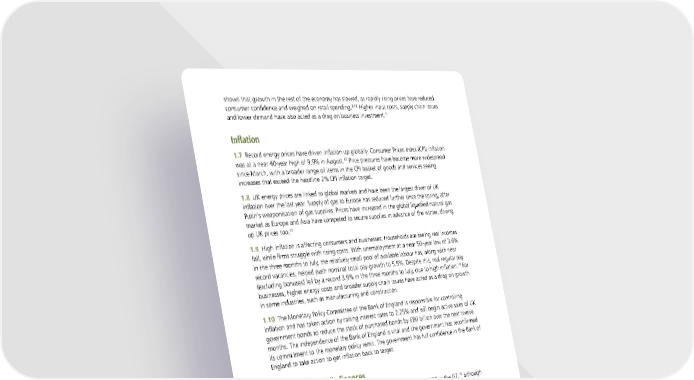 shows that growth in the rest of the economy has slowed, as rapidly rising prices have reduced 9,10 consumer confidence and weighed on retail spending. Higher input costs, supply chain issues 11 and lower demand have also acted as a drag on business investment. Inflation 1.7 Record energy prices have driven inflation up globally. Consumer Prices Index (CPI) inflation 12 was at a near 40-year high of 9.9% in August. Price pressures have become more widespread since March, with a broader range of items in the CPI basket of goods and services seeing increases that exceed the headline 2% CPI inflation target. 1.8 UK energy prices are linked to global markets and have been the largest driver of UK inflation over the last year. Supply of gas to Europe has reduced further since the spring, after Putin’s weaponisation of gas supplies. Prices have increased in the global liquefied natural gas market as Europe and Asia have competed to secure supplies in advance of the winter, driving 13 up UK prices too. 1.9 High inflation is affecting consumers and businesses. Households are seeing real incomes fall, while firms struggle with rising costs. With unemployment at a near 50-year low of 3.6% in the three months to July, the relatively small pool of available labour has, along with near record vacancies, helped push nominal total pay growth to 5.5%. Despite this, real regular pay 14 (excluding bonuses) fell by a record 3.9% in the three months to July, due to high inflation. For businesses, higher energy costs and broader supply chain issues have acted as a drag on growth in some industries, such as manufacturing and construction. 1.10 The Monetary Policy Committee of the Bank of England is responsible for controlling inflation and has taken action by raising interest rates to 2.25% and will begin active sales of UK government bonds to reduce the stock of purchased bonds by £80 billion over the next twelve months. The independence of the Bank of England is vital and the government has reconfirmed its commitment to the monetary policy remit. The government has full confidence in the Bank of England to take action to get inflation back to target. Responsible public finances 15 1.11 The UK has the second lowest gross debt as a proportion of GDP in the G7, although 16 debt is currently high by historical standards as a result of a series of significant crises. From the start of the financial year to the end of August, public sector net borrowing reached £58.2 billion. This is £21.4 billion lower than the same point last year but broadly in line with the Office for Budget Responsibility’s (OBR) March forecast to date. Higher government spending 17 has largely been offset by lower borrowing in other parts of the public sector. 1.12 The government has announced a significant policy package that will reduce the pressure on households and businesses across the UK from rising energy bills. External forecasters expect 18 this support for households to lower CPI inflation by around 5 percentage points this winter. The package will lead to additional borrowing, but by cushioning real incomes and protecting 9 GfK Consumer Confidence Index, GfK, August 2022. 10 Retail Sales, Great Britain: August 2022, Office for National Statistics, September 2022. 11 Agent’s update on business conditions, Bank of England, August 2022. 12 Consumer price inflation, UK: August 2022, Office for National Statistics, September 2022. 13 UK Natural gas (NBP), Bloomberg (FN1 Comdty), September 2022. 14 Labour Market Overview, UK: September 2022, Office for National Statistics, September 2022. 15 Fiscal Monitor, April 2022, International Monetary Fund, April 2022. 16 Public Sector Finances, UK: August 2022, Office for National Statistics, September 2022. 17 Public Sector Finances, UK: August 2022, Office for National Statistics, September 2022. 18 HM Treasury calculation of the average expected impact on the annual rate of CPI inflation, based on estimates from independent forecasters collected from 8-16 September. The Growth Plan 2022 10