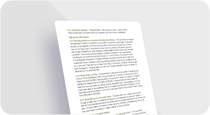 4.22 Industrial Disputes – The government is taking action to make it easier to settle industrial disputes by ensuring meaningful employer pay offers are put to employees. High quality infrastructure 4.23 Planning reform to accelerate infrastructure delivery – The Growth Plan announces new legislation (the Planning and Infrastructure Bill) to accelerate priority major infrastructure projects across England, by: minimising the burden of environmental assessments; making consultation requirements more proportionate; reforming habitats and species regulation; and increasing flexibility to make changes to a Development Consent Order once it has been submitted. It also announces sector-specific changes to accelerate infrastructure delivery, including: bringing onshore wind planning policy in line with other infrastructure to allow it to be deployed more easily in England; reforms to accelerate road delivery through more streamlined consent processes; and giving telecoms operators easier access to telegraph poles on private land. These reforms will mean that energy infrastructure, including renewables, gets built more quickly. The government will work with the devolved administrations in relation to devolved planning responsibilities. 4.24 Stamp Duty Land Tax – The government is reducing the tax burden on people buying a home. From 23 September 2022, the government will increase the threshold above which Stamp Duty Land Tax (SDLT) must be paid on the purchase of residential properties in England and Northern Ireland from £125,000 to £250,000. The government will also increase the relief that first-time buyers can receive. From 23 September 2022, the threshold at which first- time buyers begin to pay residential SDLT will increase from £300,000 to £425,000, and the maximum value of a property on which first-time buyers relief can be claimed will also increase, from £500,000 to £625,000. 4.25 Streamlining Local Growth Funds – The government has invested in local growth through a wide range of competitions and grants, but recognises that the sheer number of different funds has become onerous for some councils to navigate and deliver. Over the next two years, the government will streamline these, reducing inefficiency and bureaucracy, and giving local government the flexibility it needs to deliver for local economies. Getting the housing market moving 4.26 Increase incentives for public sector to sell surplus land – The Growth Plan announces changes to HM Treasury’s rules to allow departments to retain more income from the sale of surplus government land. These changes will encourage departments to increase the sale of public land, including sites for housing, and allow departments to reinvest to support public services. This change will be delivered through updates to current rules (Consolidated Budgeting Guidance) to give departments greater flexibility to reinvest the proceeds of land sales over multiple years. The NHS will be given full flexibility to carry forward 100% of the proceeds from land sales into future years. Devolved administrations have bespoke flexibilities to move funding between financial years the government will discuss the implications of this change with them in due course. In parallel, HM Treasury will review asset disposal targets to incentivise disposals for housing. Getting more people into work with the right skills 4.27 Basic rate of income tax – The government will bring forward the 1 percentage point cut to the basic rate of income tax to April 2023, 12 months earlier than planned. This will apply to the basic rate of non-savings, non-dividend income for taxpayers in England, Wales and Northern Ireland; the savings basic rate which applies to savings income for taxpayers across the UK; and the default basic rate which applies to non-savings and non-dividend income of any taxpayer that is not subject to either the main rates or the Scottish rates of income tax. A four- year transition period for Gift Aid relief will apply, to maintain the income tax basic rate relief at 20% until April 2027. There will also be one-year transitional period for Relief at Source (RAS) pension schemes to permit them to continue to claim tax relief at 20%. The Growth Plan 2022 30