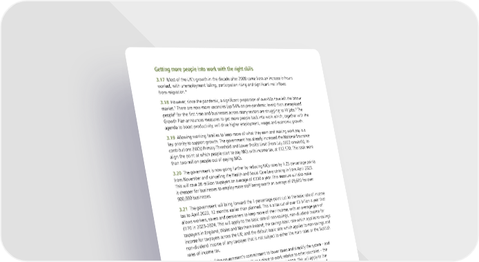 Getting more people into work with the right skills 3.17 Most of the UK’s growth in the decade after 2008 came from an increase in hours worked, with unemployment falling, participation rising and significant net inflows 6 from migration. 3.18 However, since the pandemic, a significant proportion of over-50s have left the labour 7 market. There are now more vacancies (up 54% on pre-pandemic levels) than unemployed 8 9 people for the first time and businesses across many sectors are struggling to fill jobs. The Growth Plan announces measures to get more people back into work which, together with the agenda to boost productivity, will drive higher employment, wages and economic growth. 3.19 Allowing working families to keep more of what they earn and making work pay is a key priority to support growth. The government has already increased the National Insurance contributions (NICs) Primary Threshold and Lower Profits Limit (from July 2022 onwards), to align the point at which people start to pay NICs with income tax, at £12,570. This took more than two million people out of paying NICs. 3.20 The government is now going further by reducing NICs rates by 1.25 percentage points from November and cancelling the Health and Social Care Levy coming in from April 2023. This will save 28 million taxpayers an average of £330 a year. This measure will also make it cheaper for businesses to employ more staff being worth an average of £9,600 for over 900,000 businesses. 3.21 The government will bring forward the 1 percentage point cut to the basic rate of income tax to April 2023, 12 months earlier than planned. This is a tax cut of over £5 billion a year that allows workers, savers and pensioners to keep more of their income, with an average gain of £170 in 2023-2024. This will apply to the basic rate of non-savings, non-dividend income for taxpayers in England, Wales and Northern Ireland; the savings basic rate which applies to savings income for taxpayers across the UK; and the default basic rate which applies to non-savings and non-dividend income of any taxpayer that is not subject to either the main rates or the Scottish rates of income tax. 3.22 As part of the government’s commitment to lower taxes and simplify the system – and to improve the attractiveness of the UK as a place to work relative to other countries – the additional rate of income tax will also be removed from April 2023. This will apply to the additional rate of non-savings, non-dividend income for taxpayers in England, Wales and Northern Ireland. The additional rate for savings, dividends and the default additional rate will also be removed from April 2023, and this change will apply UK-wide. This will improve the competitiveness of the UK tax system, encourage entrepreneurship and support growth. Where rates are devolved in Scotland, the Scottish Government will receive funding through the agreed fiscal framework to allocate as they see fit. 3.23 In addition, the government will reverse the 1.25 percentage point increase in dividend tax rates from April 2023. This will benefit 2.6 million dividend taxpayers with an average saving of £345 in 2023-24 and additional rate taxpayers will further benefit from the abolition of the additional rate of dividend tax. This will support entrepreneurs and investors across the UK to drive economic growth. 6 Output per hour worked, UK, Office for National Statistics, July 2022 7 Labour Market Overview, UK: September 2022, Office for National Statistics, September 2022 8 Labour Market Overview, UK: September 2022, Office for National Statistics, September 2022 9 Business insights and impact on the UK economy, Office for National Statistics, September 2022. The Growth Plan 2022 19