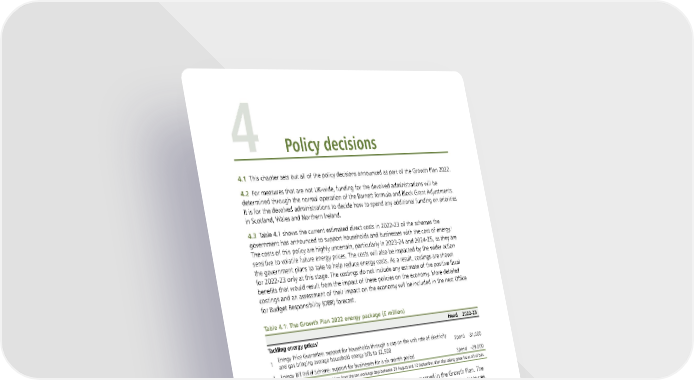 4 Policy decisions 4.1 This chapter sets out all of the policy decisions announced as part of the Growth Plan 2022. 4.2 For measures that are not UK-wide, funding for the devolved administrations will be determined through the normal operation of the Barnett formula and Block Grant Adjustments. It is for the devolved administrations to decide how to spend any additional funding on priorities in Scotland, Wales and Northern Ireland. 4.3 Table 4.1 shows the current estimated direct costs in 2022-23 of the schemes the 1 government has announced to support households and businesses with the cost of energy. The costs of this policy are highly uncertain, particularly in 2023-24 and 2024-25, as they are sensitive to volatile future energy prices. The costs will also be impacted by the wider action the government plans to take to help reduce energy costs. As a result, costings are shown for 2022-23 only at this stage. The costings do not include any estimate of the positive fiscal benefits that would result from the impact of these policies on the economy. More detailed costings and an assessment of their impact on the economy will be included in the next Office for Budget Responsibility (OBR) forecast. Table 4.1: The Growth Plan 2022 energy package (£ million) Head 2022-23 Tackling energy prices1 1 Energy Price Guarantee: support for households through a cap on the unit rate of electricity Spend -31,000 and gas bringing average household energy bills to £2,500 2 Energy Bill Relief Scheme: support for businesses for a six month period Spend -29,000 1 Costings are based on market prices taken from the ten workings days between 29 August and 12 September, after also taking green levies off of bills. 4.4 Table 4.2 sets out provisional costings for the policies announced in the Growth Plan. The costings take account of the direct behavioural response expected to result from the measures, where appropriate. For instance, cancelling the increase in the rate of Corporation Tax is expected to result in companies shifting less profit overseas, and the costing takes account of the additional revenue that results from this. Unless stated otherwise, the costings have been produced using the OBR’s economic forecast from the Spring Statement 2022, as this is the latest available official forecast. These costings will be finalised and accounted for in the public finances at the next OBR forecast. It should be noted that for some policies, for instance Investment Zones, full details on implementation are yet to be determined meaning that it is not possible to publish a costing at this stage. Such policies will be included in the public finances at a future OBR forecast, once there is sufficient certainty about their implementation. 1 Energy bills support factsheet, September 2022 The Growth Plan 2022 25