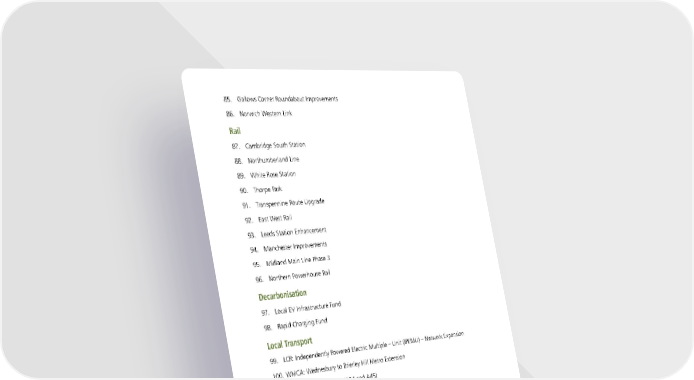 85. Gallows Corner Roundabout Improvements 86. Norwich Western Link Rail 87. Cambridge South Station 88. Northumberland Line 89. White Rose Station 90. Thorpe Park 91. Transpennine Route Upgrade 92. East West Rail 93. Leeds Station Enhancement 94. Manchester Improvements 95. Midland Main Line Phase 3 96. Northern Powerhouse Rail Decarbonisation 97. Local EV Infrastructure Fund 98. Rapid Charging Fund Local Transport 99. LCR: Independently Powered Electric Multiple – Unit (IPEMU) – Network Expansion 100. WMCA: Wednesbury to Brierley Hill Metro Extension 101. WMCA: Sprint Phase 2 (A34 and A45) 102. LCR: Green Bus Routes 103. GMCA: Initial phased delivery of Rochdale-Oldham-Ashton Corridor 104. West Yorkshire Mass Transit 105. TVCA: Middlesbrough Station 106. TVCA: Darlington Station 107. WECA: M32 Sustainable Transport Corridor and Hub 108. WYCA: Leeds City Centre Cycle Improvements 109. WMCA: East Birmingham to Solihull Corridor 110. WMCA: Walk, Cycle and Bus Access: Darlaston and Willenhall Train Stations 111. WMCA: Aldridge Station 112. WECA: Bristol to Bath Sustainable Transport Corridor 113. WMCA: Bus Priority Cross-City Routes 114. SYMCA: Supertram renewal The Growth Plan 2022 38