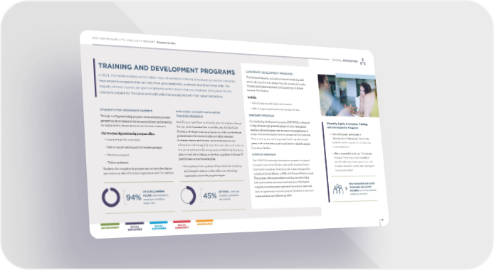 2021 SUSTAINABILITY HIGHLIGHT REPORT: Forward As One 19 SOCIAL: EMPLOYEES STUDENTS FOR INSURANCE CAREERS Through our Apprenticeship program, we are enhancing student perceptions about careers in the insurance industry and attracting the highly skilled, diverse talent we need to serve customers Our two-year Apprenticeship program offers: • Insurance-specific curriculum • Paid on-the-job training and full benefits package • Mentoring support • Tuition assistance Students who complete the program earn an associate degree and receive an offer of full-time employment with The Hartford HARTCODE ACADEMY DEVELOPER TRAINING PROGRAM Reskilling our workforce is critical as new technologies change the way we do business Now in its fifth year, the HartCode Academy developer training program provides non-developer professionals with the knowledge and skills necessary to change careers and become junior developers on our information technology (IT) team At a time when tech talent is at a premium—especially among women—HartCode Academy plays a vital role in helping us develop a pipeline of diverse IT practitioners across the enterprise • 64 employees have graduated from HartCode Academy and changed careers to roles within our technology organization since the program began 45 % OF TOTAL HartCode Academy graduates are women. LEADERSHIP DEVELOPMENT PROGRAMS The Hartford’s learning curriculum enhances leadership skill sets for all, from first-time leaders through our executive ranks Program participants represent the full spectrum of diverse talent at The Hartford In 2021: • 55% of program participants were women • 36% of program participants were people of color EMPOWER PROGRAM Our leadership development program, EMPOWER, is designed to help advance high potential people of color Participants receive a tailored program that focuses on the experiences of people of color and inspires them to unleash their full potential They receive group coaching, network with cross-functional peers, work on business projects and receive valuable insights from senior leaders STRETCH PROGRAM The STRETCH leadership development program is designed to support experienced leaders making the transition from a functional to a strategic leadership role It was redesigned for virtual and hybrid delivery in 2021 with Future of Work in mind The program offers personalized coaching and networking with senior leaders and cross-functional peers Participants complete a business project sponsored by a senior leader and have an opportunity to receive proactive feedback on executive communication and influencing skills NEW MANAGERS ARE GIVEN “MANAGING INCLUSION” TRAINING to actively promote workplace inclusion. Diversity, Equity & Inclusion Training and Development Programs • New employees participate in “Appreciating Differences” training to understand the importance of diversity in our workplace. • After a successful pilot, our “Conscious Inclusion” training is now included in our DEI offerings, focusing on bias and inclusive behavior. So far, 661 employees have participated. 94 % OF OUR LEARNING HOURS were related to employees building future skills. In 2021, The Hartford delivered 1.5 million hours of workforce training. Employees across the enterprise have access to programs that can help them grow leadership, professional and technical skills. The majority of these courses are open enrollment—which means that any employee at any level has the chance to prepare for the future and build skills that are aligned with their career aspirations. TRAINING AND DEVELOPMENT PROGRAMS