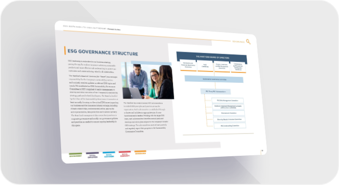 2021 SUSTAINABILITY HIGHLIGHT REPORT: Forward As One GOVERNANCE 32 ESG GOVERNANCE STRUCTURE ESG leadership is embedded in our business strategy, paving the way for resilient insurance solutions, sustainable products and more effective risk underwriting to protect our customers and create enduring value for all stakeholders The Hartford’s Board of Directors (the “Board”) has oversight responsibility for the Company’s sustainability matters and routinely receives updates on relevant ESG topics and trends We established an ESG Sustainability Governance Committee in 2017, comprised of senior management, to develop and drive execution of the Company’s sustainability strategy, goals and related disclosures The Board is briefed by the Chair of the Sustainability Governance Committee at least annually, focusing on the critical ESG issues impacting our business and the insurance industry at large, including climate-related risks, environmental action, pay equity and representation, data protection and customer privacy The Board and management also review best practices in corporate governance and modify our governance policies and practices as needed to ensure ongoing leadership in this space The Hartford has created several ESG subcommittees to embed ESG principles and practices across the organization Each subcommittee is established through a charter and includes an appropriate mix of cross- functional senior leaders Working with the larger ESG team, each subcommittee identifies annual goals and develops execution plans aligned to the company’s broader ESG strategy The subcommittees meet at least quarterly and regularly report their progress to the Sustainability Governance Committee Nominating and Corporate Governance Committee Audit Committee ESG Team/ESG Subcommittees ESG Risk Management Committee Hartford Investment Management Company (HIMCO) ESG Committee Environment Committee Diversity, Equity & Inclusion Committee ESG Underwriting Committee Finance, Investment and Risk Management Committee Compensation and Management Development Committee THE HARTFORD BOARD OF DIRECTORS Sustainability Governance Committee
