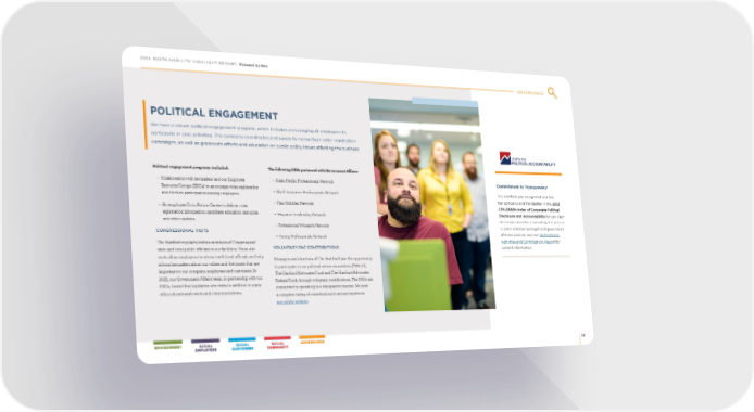 2021 SUSTAINABILITY HIGHLIGHT REPORT: Forward As One GOVERNANCE 37 Political engagement programs included: • Collaboration with lawmakers and our Employee Resource Groups (ERGs) to encourage voter registration and election participation among employees • An employee Civic Action Center to deliver voter registration information, candidate education resources and other updates CONGRESSIONAL VISITS The Hartford regularly invites members of Congress and state and local public officials to our facilities These site visits allow employees to interact with local officials and help inform lawmakers about our values and the issues that are important to our company, employees and customers In 2021, our Government Affairs team, in partnership with our ERGs, hosted five legislative site visits in addition to many other educational events and communications The following ERGs partnered with Government Affairs: • Asian Pacific Professionals Network • Black Insurance Professionals Network • Flex-Abilities Network • Hispanic Leadership Network • Professional Women’s Network • Young Professionals Network VOLUNTARY PAC CONTRIBUTIONS Managers and directors of The Hartford have the opportunity to participate in our political action committees (“PACs”), The Hartford Advocates Fund and The Hartford Advocates Federal Fund, through voluntary contributions The PACs are committed to operating in a transparent manner We post a complete listing of contributions in annual reports on our public website Commitment to Transparency The Hartford was recognized as a top tier company and trendsetter in the 2021 CPA-Zicklin Index of Corporate Political Disclosure and Accountability for our clear disclosure of political spending, the policies in place and our oversight and governance of these policies. See our 2021 Political Activities and Contributions Report for current information. We have a robust political engagement program, which includes encouraging all employees to participate in civic activities. The company coordinates and supports nonpartisan voter registration campaigns, as well as grassroots efforts and education on public policy issues affecting the business. POLITICAL ENGAGEMENT