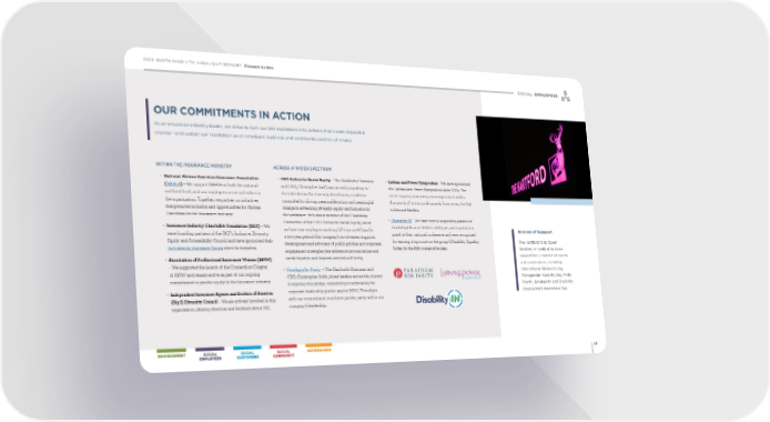2021 SUSTAINABILITY HIGHLIGHT REPORT: Forward As One 17 SOCIAL: EMPLOYEES As an insurance industry leader, we strive to turn our DEI aspirations into actions that create impactful change—and sustain our reputation as an employer, business and community partner of choice. OUR COMMITMENTS IN ACTION WITHIN THE INSURANCE INDUSTRY • National African American Insurance Association ( NAAIA ) – We support NAAIA at both the national and local level, and our employees serve as leaders in the organization Together, we partner on initiatives that promote inclusion and opportunities for African Americans in the insurance industry • Insurance Industry Charitable Foundation (IICF) – We were founding partners of the IICF’s Inclusive, Diversity, Equity and Accessibility Council and have sponsored their Inclusion in Insurance Forum since its inception • Association of Professional Insurance Women (APIW) – We supported the launch of the Connecticut Chapter of APIW and remain active as part of our ongoing commitment to gender equity in the insurance industry • Independent Insurance Agents and Brokers of America (Big I) Diversity Council – We are actively involved in this organization, sharing direction and feedback about DEI ACROSS A WIDER SPECTRUM • CEO Action for Racial Equity – The Hartford’s Chairman and CEO, Christopher Swift, was an early signatory to the CEO Action for Diversity & Inclusion, a coalition committed to driving measurable action and meaningful change in advancing diversity, equity and inclusion in the workplace He’s also a member of the Governing Committee of the CEO Action for Racial Equity, where we have two employees working full time as Fellows for a two-year period Our company’s involvement supports development and advocacy of public policies and corporate engagement strategies that address structural racism and social injustice and improve societal well-being • Paradigm for Parity – The Hartford’s Chairman and CEO, Christopher Swift, joined leaders across the country in signing this pledge, committing to addressing the corporate leadership gender gap by 2030 This aligns with our commitment to achieve gender parity within our company’s leadership • Latinas and Power Symposium – We have sponsored the Latinas and Power Symposium since 2014 The event inspires, motivates, encourages and enables thousands of Latina professionals from across the U S to become leaders • Disability:IN – We have been a supporting partner of Disability:IN since 2016 In 2021, we participated in a panel at their national conference and were recognized for earning a top score on the group’s Disability Equality Index for the fifth consecutive year Beacon of Support The Hartford lit its Tower Building in Hartford to show support for a number of events and celebrations, including International Women's Day, Transgender Visibility Day, Pride Month, Juneteenth and Disability Employment Awareness Day.