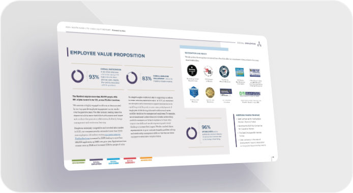 2021 SUSTAINABILITY HIGHLIGHT REPORT: Forward As One 18 SOCIAL: EMPLOYEES The Hartford employs more than 18,000 people, with 99% of jobs located in the U.S., across 78 office locations. We maintain a highly engaged workforce, as demonstrated by our top quartile employee engagement survey results over the past five years We offer industry-leading talent the chance to build a career that’s filled with purpose and impact and a culture that promotes collaboration, feedback, change management and continuous learning Despite an extremely competitive and crowded labor market in 2021, our company proudly onboarded more than 2,300 new employees Job seekers visiting our career page on TheHartford.com increased by 268% leading to more than 166,000 applicants, up 144% over prior year Applications from women were up 264% and increased 211% for people of color An adaptive, agile workforce is key to supporting our efforts to create enduring stakeholder value In 2021, we conducted an enterprise skills inventory to support investments in the upskilling, re-skilling and, in some cases, redeployment of employees while driving informed workforce and career mobility decisions for managers and employees For example, as we transformed underwriters into broader underwriting portfolio managers, we helped employees in these roles acquire new skills such as risk engineering and critical thinking to increase their impact We also coached claims representatives to grow customer empathy, problem solving and relationship management skills so that they are better equipped to administer complex claims 83 % OVERALL EMPLOYEE ENGAGEMENT is above the insurance industry average. 93 % OVERALL PARTICIPATION in our annual employee satisfaction survey is 1% higher than the three previous years, despite the volatility associated with the pandemic. RECOGNITION AND REACH We take pride in the recognition we received from others that reflect our commitment to being inclusive of our many valued stakeholders Additional Awards Received • Best Companies for Multicultural Women; Working Mother • Seramount's 2021 Top Companies for Executive Women • The Best Employers for Women; Forbes • 5 star company in the area of Employment; Hispanic Association on Corporate Responsibility (HACR) 96 % OF EMPLOYEES receive performance reviews annually; 4% are too new to review due to the timing of their hiring. Bloomberg Gender Equality Index 2020 Women on Boards Top Military Friendly Employer 2020 Forbes Best Employers for Diversity “A Best Place to Work for LGBTQ Equality” from the Human Rights Campaign Foundation DEI Insurance Innovators Best for Vets Employers Diversity Best Practices “Best Places to Work” from the 100% Disability Equality Index (DEI) EMPLOYEE VALUE PROPOSITION