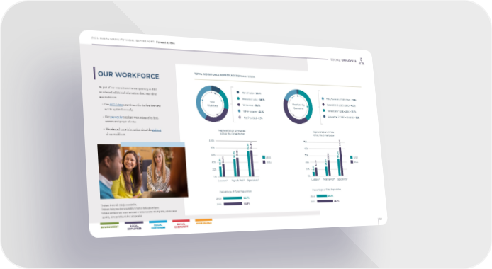2021 SUSTAINABILITY HIGHLIGHT REPORT: Forward As One 15 SOCIAL: EMPLOYEES As part of our commitment to transparency, in 2021 we released additional information about our talent and workforce: • Our EEO-1 data was released for the first time and will be updated annually • Our pay equity numbers were released for both women and people of color • We released more information about the makeup of our workforce TOTAL WORKFORCE REPRESENTATION Data as of 12/31/2021 Baby Boomers (1946-1964) - 17.8% Generation X (1965-1980) - 42.2% Generation Y (1981-1996) - 37.7% Generation Z (1997 - onwards) - 2.2% Men of color - 10.0% Women of color - 19.7% White men - 29.1% White women - 40.9% Not Provided - 0.3% Total Workforce Workforce by Generation 60.7% 60.7% 2010 2021 Representation of Women Across the Organization Percentage of Total Population Percentage of Total Population 2010 2021 2010 2010 2021 2021 Leaders 1 Mgrs & Prof 2 Specialists 3 100% 80% 60% 40% 20% 0% 30.9% 36.3% 50.1% 71.2% 53.6% 74.8% Representation of POC Across the Organization Leaders 1 Mgrs & Prof 2 Specialists 3 50% 40% 30% 20% 10% 0% 6.2% 12.7% 13.4% 25.1% 23.0% 42.2% 19.4% 29.7% OUR WORKFORCE 1 Employees in roles with strategic accountabilities. 2 Employees having more direct accountability for teams of individual contributors. 3 Individual contributors who perform work based on technical specialties including: billing, customer service specialists, claims specialists, and direct sales specialists.