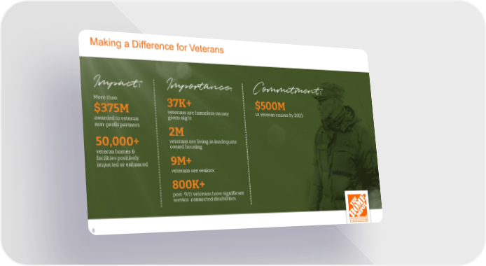 Making a Difference for Veterans Impact: Importance: Commitment: More than 37K+ $500M $375M veterans are homeless on any to veteran causes by 2025 awarded to veteran given night non-profit partners 2M 50,000+ veterans are living in inadequate owned housing veteran homes & facilities positively 9M+ impacted or enhanced veterans are seniors 800K+ post-9/11 veterans have significant service-connected disabilities 8 8