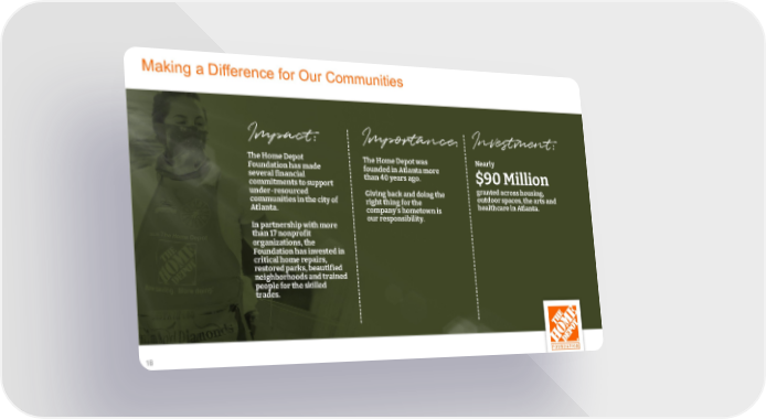 Making a Difference for Our Communities Impact: Importance: Investment: The Home Depot The Home Depot was Nearly Foundation has made founded in Atlanta more several financial than 40 years ago. $90 Million commitments to support granted across housing, under-resourced Giving back and doing the outdoor spaces, the arts and communities in the city of right thing for the healthcare in Atlanta. Atlanta. company's hometown is In partnership with more our responsibility. than 17nonprofit organizations, the Foundation has invested in critical home repairs, restored parks, beautified neighborhoods and trained people for the skilled trades. 18 18
