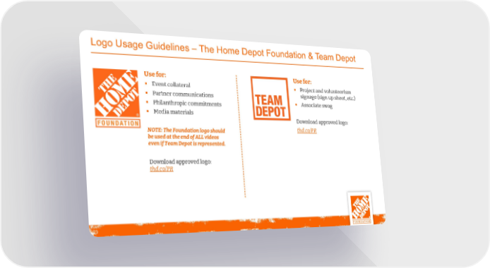 Logo Usage Guidelines – The Home Depot Foundation & Team Depot Use for: Use for: § Event collateral § Project and volunteerism § Partner communications signage (sign up sheet, etc.) § Philanthropic commitments § Associate swag § Media materials Download approved logo: NOTE: The Foundation logo should thd.co/PR be used at the end of ALL videos even if Team Depot is represented. Download approved logo: thd.co/PR 23