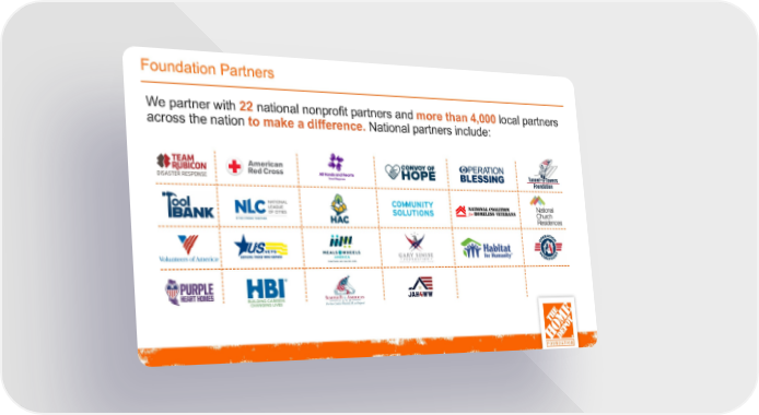 The Home Depot Brand Book Page 2 Page 4Foundation Partners We partner with 22 national nonprofit partners and more than 4,000 local partners across the nation to make a difference. National partners include: 3