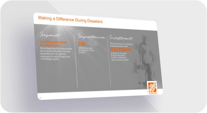Making a Difference During Disasters Impact: Importance: Investment: Providing help where 314 The Home Depot Foundation it’s needed most. committed more than Rebuilding hope for communities official disasters $4.1 Million hit by natural disasters through declared by FEMA immediate on-the-ground in 2020 to disaster response in areas impacted assistance as well as long-term by fires, hurricanes rebuilding support and tornadoes in 2021 11 11