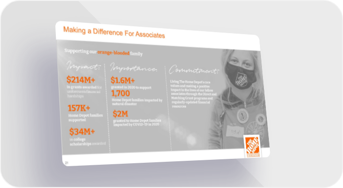 Making a Difference For Associates Supporting our orange-blooded family Impact: Importance: Commitment: $214M+ $1.6M+ Living The Home Depot’s core granted in 2020 to support values and making a positive in grants awarded for impact in the lives of our fellow unforeseen financial 1,700 associates through the Direct and hardships Matching Grant programs and Home Depot families impacted by regularly-updated financial 157K+ natural disaster resources Home Depot families $2M supported granted to Home Depot families impacted by COVID-19 in 2020 $34M+ in college scholarships awarded 21 21