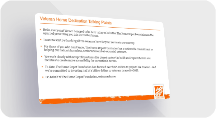 Veteran Home Dedication Talking Points § Hello, everyone! We are honored to be here today on behalf of The Home Depot Foundation and be a part of presenting you this incredible home. § I want to start by thanking all the veterans here for your service to our country. § For those of you who don’t know, The Home Depot Foundation has a nationwide commitment to helping our nation’s homeless, senior and combat-wounded veterans. § We work closely with nonprofit partners like [insert partner] to build and improve homes and facilities to create more accessibility for our nation’s heroes. § To date, The Home Depot Foundation has donated over $375 million to projects like this one –and we’re committed to investing half of a billion dollars to veterans in need by 2025. § On behalf of The Home Depot Foundation, welcome home. 7