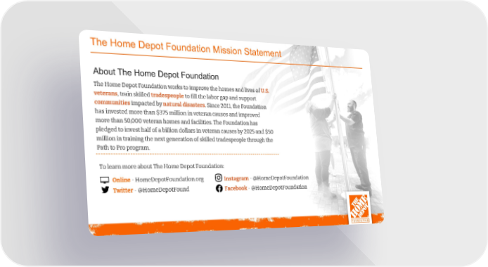 The Home Depot Foundation Mission Statement About The Home Depot Foundation The Home Depot Foundation works to improve the homes and lives of U.S. veterans, train skilled tradespeopleto fill the labor gap and support communitiesimpacted by natural disasters. Since 2011, the Foundation has invested more than $375 million in veteran causes and improved more than 50,000 veteran homes and facilities. The Foundation has pledged to invest half of a billion dollars in veteran causes by 2025 and $50 million in training the next generation of skilled tradespeople through the Path to Pro program. To learn more about The Home Depot Foundation: Online-HomeDepotFoundation.org Instagram-@HomeDepotFoundation Twitter-@HomeDepotFound Facebook-@HomeDepotFoundation 2