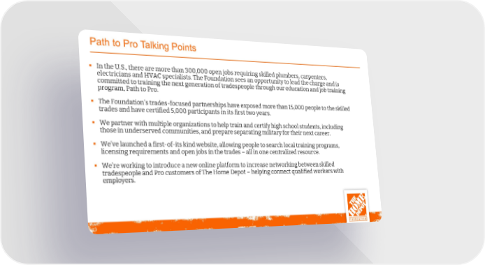 Path to Pro Talking Points § In the U.S., there are more than 300,000 open jobs requiring skilled plumbers, carpenters, electricians and HVAC specialists. The Foundation sees an opportunity to lead the charge and is committed to training the next generation of tradespeople through our education and job training program, Path to Pro. § The Foundation’s trades-focused partnerships have exposed more than 15,000 people to the skilled trades and have certified 5,000 participants in its first two years. § We partner with multiple organizations to help train and certify high school students, including those in underserved communities, and prepare separating military for their next career. § We’ve launched a first-of-its kind website, allowing people to search local training programs, licensing requirements and open jobs in the trades –all in one centralized resource. § We’re working to introduce a new online platform to increase networking between skilled tradespeople and Pro customers of The Home Depot –helping connect qualified workers with employers. 13