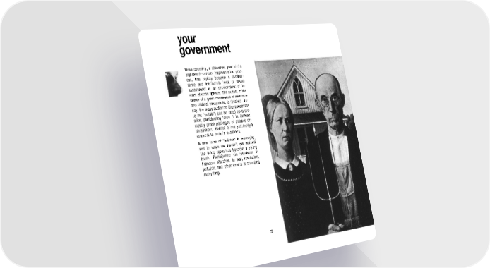 your government Nosecounting, a cherished part of the eighteenthcentury fragmentation proc ess, has rapidly become a cumber some and ineffectual form of social assessment in an environment of in stant electric speeds. The public, in the sense of a great consensus of separate and distinct viewpoints, is finished. To day, the mass audience (the successor to the "public") can be used as a cre ative, participating force. It is, instead, merely given packages of passive en tertainment. Politics offers yesterday's answers to today's questions. A new form of "politics" is emerging, and in ways we haven't yet noticed. The living room has become a voting booth. Participation via television in Freedom Marches, in war, revolution, pollution, and other events is changing everything. 22