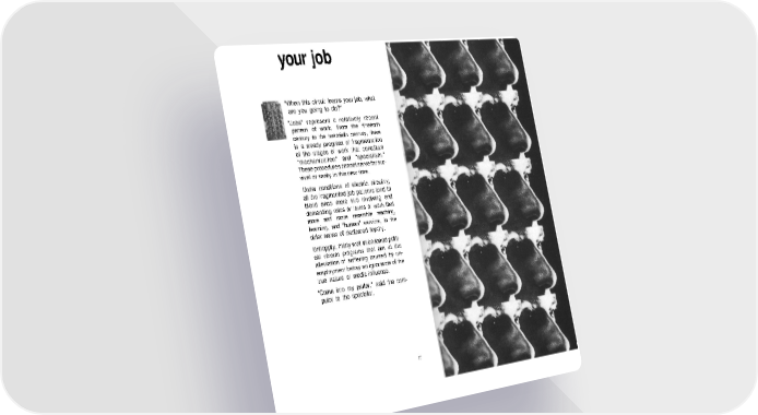 your job "When this circuit learns your job, what are you going to do?" "Jobs" represent a relatively recent pattern of work. From the fifteenth century to the twentieth century, there is a steady progress of fragmentation of the stages of work that constitute "mechanization" and "specialism." These procedures cannot serve for sur vival or sanity in this new time. Under conditions of electric circuitry, all the fragmented job patterns tend to blend once more into involving and demanding roles or forms of work that more and more resemble teaching, learning, and "human" service, in the older sense of dedicated loyalty. Unhappily, many wellintentioned politi cal reform programs that aim at the alleviation of suffering caused by un employment betray an ignorance of the true nature of mediainfluence. "Come into my parlor," said the com puter to the specialist. 20