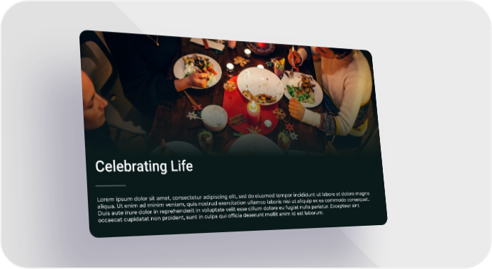Celebrating Life Lorem ipsum dolor sit amet, consectetur adipiscing elit, sed do eiusmod tempor incididunt ut labore et dolore magna aliqua. Ut enim ad minim veniam, quis nostrud exercitation ullamco laboris nisi ut aliquip ex ea commodo consequat. Duis aute irure dolor in reprehenderit in voluptate velit esse cillum dolore eu fugiat nulla pariatur. Excepteur sint occaecat cupidatat non proident, sunt in culpa qui officia deserunt mollit anim id est laborum.
