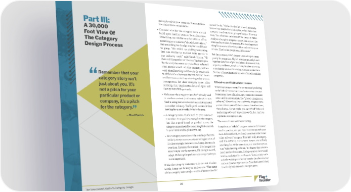not apply only to your company. Stay away from us, said Sarah. “We had to do a lot of work internally Part III: branded or trademarked terms. to convince people that picking the perfect name that A 30,000 • Consider whether the category name should everyone loved was never going to happen. That was build upon familiar terms or be entirely new. okay. You often see variations in the category name. Foot View Of Something too similar may be written off as Analysts often give categories names that are not the something your audience “already knows about.” ones used by vendors, for example. The most important The Category But something too foreign may be too difficult thing for us was to define the problem and create a point Design Process to grasp. “We ended up picking something of view. That’s what people should focus on.” that was similar to another term people in But the company didn’t choose a new category name our industry used,” said Sarah Elkins, VP, purely for semantics. Skyfii’s solution not only fused Demand Generation at Tasktop Technologies. together data from digital and physical sources (think “In the end, the name we picked best reflected airports, stadiums, retail outlets), its data scientists what people would call this category, and we were heavily involved in adding meaning to that data. went ahead knowing we’d have to do some work Neither of these characteristics was reflected in existing Remember that your to differentiate between the two terms.” Sarah categories. category story isn’t and her team ended up selecting value stream “ management for their category name, after Official vs. unofficial category names just about you. It’s realising that implementations of Agile and When I say category name, I’m not necessarily referring not a pitch for your DevOps were failing at scale. to the “official” terms that G2 and other review sites use. particular product or • Make sure the category name isn’t already used Sometimes, those official category names are the same in another context. Just because nobody in B2B ones used in conversation, like “project management company, it’s a pitch SaaS is using this term doesn’t mean it’s not used software”. When those line up with the category name for the category. in another industry. You’ll spend too much time you’ve defined yourself, that’s a bonus. But other times, ” battling for search traffic if this is the case. they diverge. For example, you won’t find “inbound marketing software” anywhere on G2, but that’s as — Brad Zomick • A category name that’s hard to pronounce or legitimate a category as any. remember. Your goal is to evangelize the category. Just like a good brand or product name, the The reverse is also worth considering. category name should be something that can stick Sometimes an “official” category name on G2 is never in your mind and be pleasant to say. used in practice, and you need to come up with your • Your category name doesn’t have to be perfect. It’s own. At BombBomb, we found ourselves in the “other unlikely everyone on your team will agree on it. If video software” category. This isn’t really a category, it’s close enough, then move on. It may also morph and it’s certainly not a term buyers are actively over time. Listen to the market – if it changes it to searching for. At the same time, our next best option an acronym, use the acronym. If it changes a word, was “video hosting software,” a category that covers a adapt. Defining the problem and category story is lot of unrelated solutions. Listing ourselves there would more important. lead to confusion for our buyers. To solve this, we’re actively working on a better term to describe what we While the category name may only consist of a few and our direct competitors do. Once that’s established, words, it may not be easy to land on one. “The name it will only help the entire category grow. of the category was a major source of contention for The Newcomer’s Guide to Category Design 23