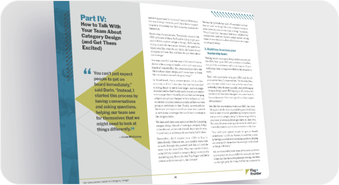 something you need to “convince” them of. Ultimately, “For me, the lightbulb that went off was when I realized Part IV: like any strategic decision, you’ll have better support that we were no longer the only company trying to long term if you help the CEO make the decision for make personal, one-to-one video a thing,” he shared. How to Talk With themselves. “Once I saw that the space had been validated by Your Team About Here’s what Conor advises. “Everybody comes to the competitors, and that there’s a major market taking CEO with tons of ideas. So if you’re trying to get your shape, I knew that we couldn’t afford to wait any longer Category Design own CEO to explore category design, don’t start by on category design. (and Get Them trying to provide the answer. Instead, ask questions. 3. Build buy-in across your Questions like: what do you think the future of our leadership team Excited) company will look like, and how do you think about our strategy? Making the call on category design needs to extend past You may even find out that your CEO doesn’t have a the CEO. Sure, your CEO can put down a mandate, desire to be a category leader, which will save you a but you’ll be much better off in the long run if your bunch of wasted effort. But once you know how she leadership team is supportive before the decision is thinks about those things, you’ll know how to frame made. You can’t just expect the conversation around category design.” “Don’t talk exclusively with your CEO and risk all people to get on At BombBomb, these conversations led to a few your capital there,” Conor told me. “At the same time, “ conclusions. First, it was clear that our business had you also need to build your case with the rest of your board immediately,” a strong desire to move into larger, more strategic leadership team. Because typically, once you bring up said Darin. “Instead, I accounts, and we had already made several investments category design, your CEO is going to talk to the other started this process by to help us get there. Secondly, we saw that our emerging executives to hear their thoughts. You want them to category was going to happen “with or without us,” and have a chance to think through this so they support having conversations we needed to make a conscious choice of how we were the discussion.” and asking questions, going to participate in that. Finally, we realized that Just like the conversation with your CEO, the worst the tenure and experience of our team could provide thing you can do when approaching your leadership helping our team see us with some advantages that could help us emerge as team is come in too hot, guns blazing, trying to convince for themselves that we the category leader. everyone that category design is the way to go. Ideally, might need to look at We then used these conclusions as a lens for discussing you want to let each person get there on their own. category design. Instead of looking at category design For now, focus on creating a situation in which your things differently.” in the abstract, we were able to talk about specific ways leadership team is open to and interested in the idea. it could help us achieve goals we already had in place. “You can’t just expect people to get on board — Conor McKluskey Remember, don’t expect your CEO to buy-in immediately,” said Darin. “Instead, I started this process immediately. Chances are, you needed some time by having conversations and asking questions, helping to work through this yourself, and that will only be our team see for themselves that we might need to look more true for your CEO. This was true for Conor, at things differently.” as he initially looked at category design as more of a Ask your leadership team some of the same questions marketing play. But as he read Play Bigger and had a you’ve presented to your CEO. For example, ask them chance to think through it, that changed. if they feel like the existing business strategy has them on the right path. Or if they feel like the company has The Newcomer’s Guide to Category Design 30