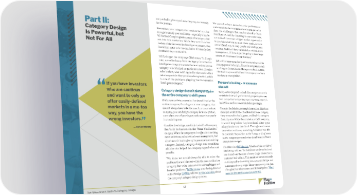 are just looking for a quick win, they may not be ready We wanted to learn more about the problems our Part II: for the journey. customers have that are more extensive and pervasive Remember, your category also needs to be lucrative than the challenges that can be solved by Mass Category Design enough to satisfy your ambitions – especially if you’re Notification. And by listening to our customers, Is Powerful, but VC-funded. Gong is a great example of a company that we realized there was a bigger market opportunity ran into this restriction. While they were the clear to provide solutions to meet these needs. A more Not For All leaders of the Conversation Intelligence category, they consolidated way to keep people safe and systems found that space to be too restrictive. Ultimately they running. And that’s how we landed on critical event decided to step outside of it. management…If done right, it’s going to have huge returns on investment for our business.” Udi Ledorgor, the company’s CMO states, “In Gong’s Jeff and his team were clearly on to something and the case, we walked away from the legacy Conversation strategy proved to be right. Since the company started Intelligence category to create the revenue intelligence working on Critical Event Management back in 2016, category, which helped us get the attention of senior the stock is up several-fold and the company now has a sales leaders, who won’t typically take a call with a market cap over $5 billion. solution provider they perceive as being tactical, which is one of the problems plaguing the Conversation Prepare to be king – or someone If you have investors Intelligence category.” else will “who are cautious Category design doesn’t always require Will you be prepared to lead this category once it’s and want to only go the entire company to shift gears established? Or will you be merely preparing the way after easily-defined While some of the examples I’ve shared involve the for a competitor to take the crown once the category is entire company focusing on a new category, that built? You need to answer this before you begin. markets in a me-too doesn’t always have to be the case. In a more mature Consider the Salesforce example from earlier. Salesforce way, you have the company, you can design a category for a new product, didn’t just establish the cloud-based software category, wrong investors. even when one of your legacy cash cows sits squarely they prepared to build, grow, and lead the category ” in an existing one. from day one. While they started as a CRM company, Consider Everbridge, a publicly-traded SaaS company it wasn’t long before they introduced other types — Kevin Maney of applications to the cloud. Through continuous that built its business in the “Mass Notification” innovation and heavy marketing, Salesforce was able category. When the company set its sights on something to maintain its position as the “category king” even more ambitious, called critical event management, that as the category grew and other cloud-based software didn’t mean it had to give up its presence in an existing companies emerged. category. Instead, category design was something additive that helped the company expand what was Consider what Bill Macaitis, Salesforce’s former SVP of possible. Marketing, told me. “At Salesforce we always believed “We knew we would always be able to solve the our brand was the sum of every single interaction a problems that are inherent within the mass notification customer had with us. This meant we were constantly category, but we’re interested in solving bigger and evolving and re-inventing how we could delight our broader problems,” Jeff Benanto, a marketing director customers at every stage. There was no endpoint, just at Everbridge (EVBG), told me in this interview about a long journey of customer-centric touchpoints.” Hear the company’s category design process. more on this in this interview with Bill. The Newcomer’s Guide to Category Design 17