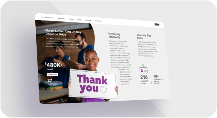 Diversity Day Picnic In 2021, Grand & Toy’s Pause and Affect Council hosted the first ever Diversity Day Picnic. The event fostered inclusion, created a safe space for cultural expression, and provided an opportunity for a record-breaking afternoon. Increasing Inclusivity As part of our efforts to drive belonging and inclusivity, Grand & Toy launched quarterly newsletters to increase engagement with French speaking associates. Office Depot implemented gender inclusivity options, providing associates with the ability to self-identify their pronouns and preferred name, and select nonbinary as a gender. We also added the capability for associates to self- identify as a veteran, which allows us to recognize their service and extend veteran-specific opportunities. 26. INTRODUCTION GOVERNANCE PLANET PEOPLE PROSPERITY SASB INDEX 26. INTRODUCTION GOVERNANCE PLANET PEOPLE PROSPERITY SASB INDEX Martin Luther King, Jr. Day Donation Drive The Women of Color and Men of Color ARGs, in collaboration with Community Investment, launched a Martin Luther King, Jr. Day Donation Drive in all Office Depot and OfficeMax stores. 27 Title I Schools BENEFITING $ 480K + raised 216 associates attended 40 % of Grand & Toy’s associate population